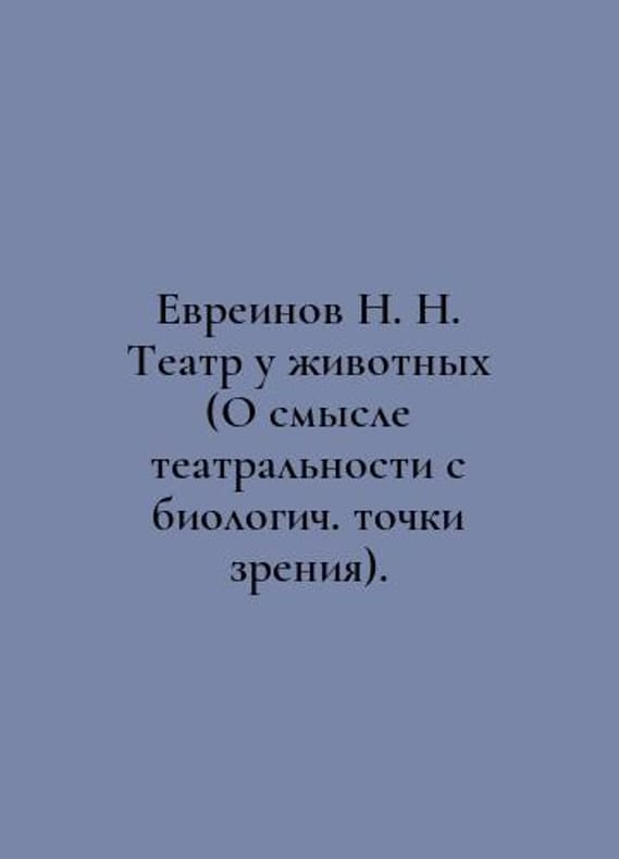 N. N. Jewish Theatre in Animals (On the Meaning of Theatricality from a Biological Point of View). In Russian /Evreinov N. N. Teatr u zhivotnykh (O smysle teatralnosti s biologich. tochki zreniya). Moscow Publishing House V. Sekachev 2024. 72 s. You are welcome to reach out to us for a detailed description of the copies currently available. Delivery of this book may take longer than usual including extended processing and pre-shipping time, no expedited shipping is available. Please advise us if you have a set date or a deadline to receive your order.SKUalbf1dc4f28533e4aec