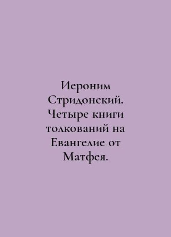 Hieronymus of Stridon. Four books of interpretation on the Gospel of Matthew. In Russian /Ieronim Stridonskiy. Chetyre knigi tolkovaniy na Evangelie ot Matfeya. M St. Pauls Educational and Infant Ecumenical Center, 272You are welcome to reach out to us for a detailed description of the copies currently available. Delivery of this book may take longer than usual including extended processing and pre-shipping time, no expedited shipping is available. Please advise us if you have a set date or a deadline to receive your order. SKUalbf27c4a81a8578dfb