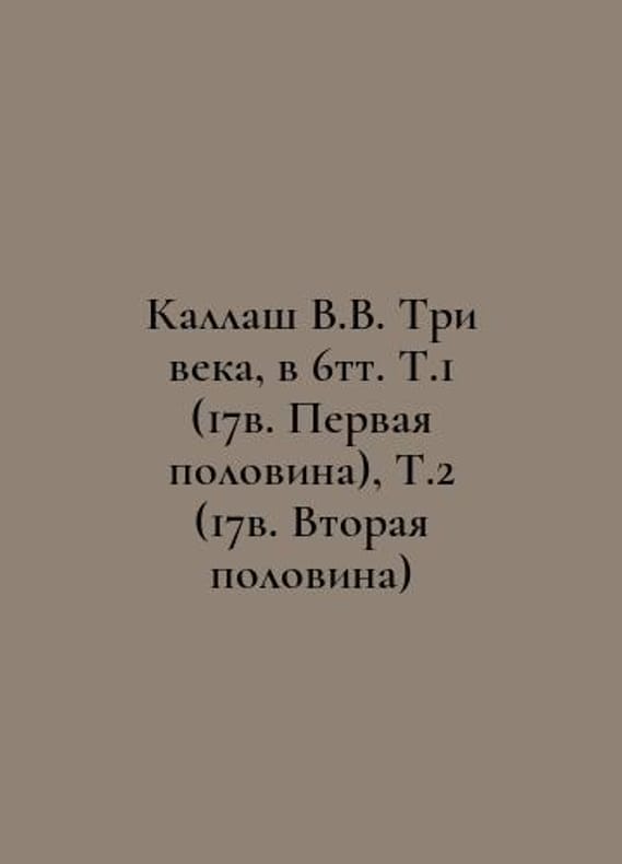 Kallash V.V. Three Centuries, in 6t. T.1 (17th c. First half), T2 (17th c. Second half) In Russian /Kallash V.V. Tri veka, v 6tt. T.1 (17v. Pervaya polovina), T.2 (17v. Vtoraya polovina) Reprint 1912. You are welcome to reach out to us for a detailed description of the copies currently available. Delivery of this book may take longer than usual including extended processing and pre-shipping time, no expedited shipping is available. Please advise us if you have a set date or a deadline to receive your order.SKUalbf5c8a5118121ffb6