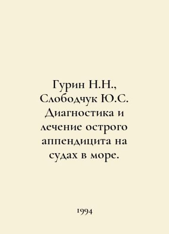 Gurin N.N., Slobodchuk Yu.S. Diagnosis and treatment of acute appendicitis on ships at sea. In Russian /Gurin N.N., Slobodchuk Yu.S. Diagnostika i lechenie ostrogo appenditsita na sudakh v more. Monograph of St. Petersburg Leak 1994..You are welcome to reach out to us for a detailed description of the copies currently available. Delivery of this book may take longer than usual including extended processing and pre-shipping time, no expedited shipping is available. Please advise us if you have a set date or a deadline to receive your order. SKUalbfabadd83a34c238a