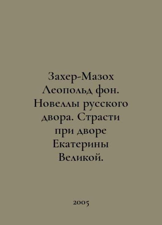 Sacher-Masoch Leopold von. Novels of the Russian Court. Passion at Catherine the Greats Court. In Russian /Zakher-Mazokh Leopold fon. Novelly russkogo dvora. Strasti pri dvore Ekateriny Velikoy. Series: The Intimate Life of the Monarchs of St. Petersburg Institute of Soitology 2005. You are welcome to reach out to us for a detailed description of the copies currently available. Delivery of this book may take longer than usual including extended processing and pre-shipping time, no expedited shipping is available. Please advise us if you have a set date or a deadline to receive your order.SKUalbfb627783573a1790