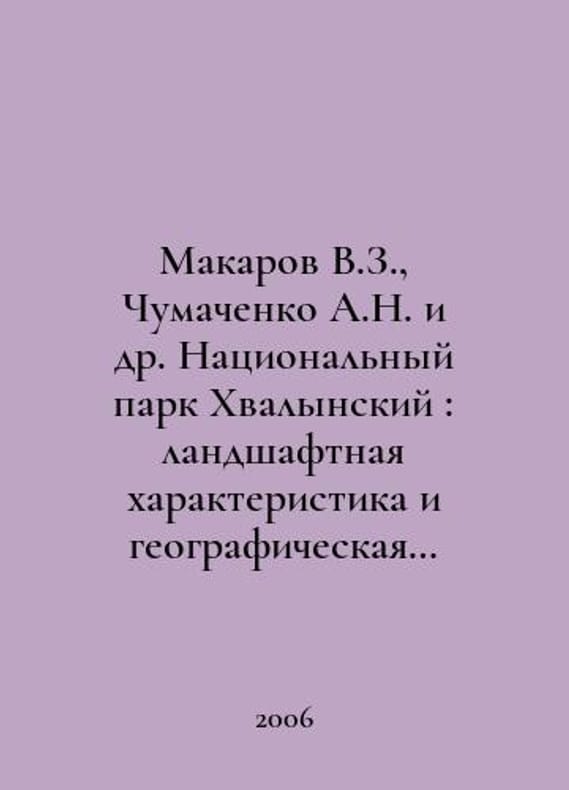Makarov V.Z., Chumachenko A.N. et al. Khvalynsky National Park: Landscape Characteristics and Geographic Information System. In Russian /Makarov V.Z., Chumachenko A.N. i dr. Natsionalnyy park Khvalynskiy : landshaftnaya kharakteristika i geograficheskaya informatsionnaya sistema. Saratov. Publishing House of Saratov University. 2006..You are welcome to reach out to us for a detailed description of the copies currently available. Delivery of this book may take longer than usual including extended processing and pre-shipping time, no expedited shipping is available. Please advise us if you have a set date or a deadline to receive your order. SKUalbfc29414d861f817f