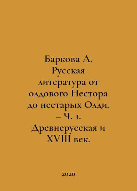 Barkova A. Russian Literature from Old Nestor to Old Oldies. Part 1. Ancient Russian and 18th Century. In Russian /Barkova A. Russkaya literatura ot oldovogo Nestora do nestarykh Oldi. Ch. 1. Drevnerusskaya i XVIII vek. Series: The PRO Lectures by M. RIPOL Classic 2020. You are welcome to reach out to us for a detailed description of the copies currently available. Delivery of this book may take longer than usual including extended processing and pre-shipping time, no expedited shipping is available. Please advise us if you have a set date or a deadline to receive your order.SKUalbfd42360f834819db