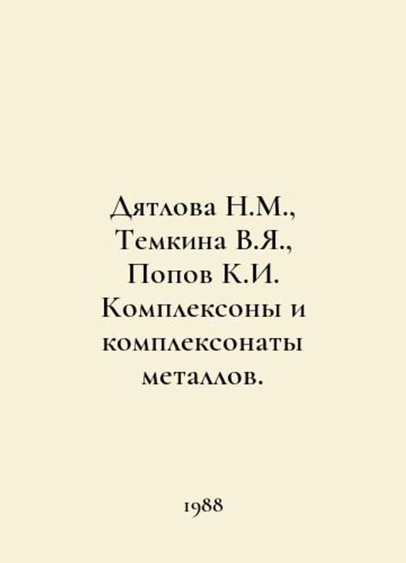 Dyatlova N.M., Temkina V.Ya., Popov K.I. Complexons and complexonates of metals. In Russian /Dyatlova N.M., Temkina V.Ya., Popov K.I. Kompleksony i kompleksonaty metallov. Moscow Publishing House Khimiya. 1988..You are welcome to reach out to us for a detailed description of the copies currently available. Delivery of this book may take longer than usual including extended processing and pre-shipping time, no expedited shipping is available. Please advise us if you have a set date or a deadline to receive your order. SKUalbffab54a415934e6a