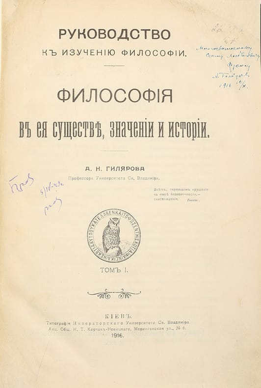 "In Russian. Short description: Gilyarov, A.N. [autograph] Philosophy in its Essence, Significance, and History: A Guide to the Study of Philosophy. By A.N. Gilyarov, Professor at St. Vladimir's University. Kiev: Typography of St. Vladimir's Imperial University, 1916. Volume 1. (sole edition). [2], XXIV p., [2], 644, [1] p.; 26.2x18.5 cm. The book was sold out within a few weeks. It analyzes the meaning and place of philosophy in the system of humanities education. Alexey Nikitich Gilyarov (1856-1938) was a philosopher, literary scholar, psychologist, and educator. On the title page, there is an autograph with a dedication addressed to the prominent Russian philosopher, religious thinker, and psychologist Semen Ludwigovich Frank (1877-1950): ""To the highly respected Semen Ludwigovich Frank, A. Gilyarov, 1916 - 10/X."" Bound in a half-leather binding, stylized to resemble period bindings. Gold embossing on the spine. Professional restoration of a corner of the title page. Please feel free to contact us for a detailed description of the copies available. SKUMS000410"