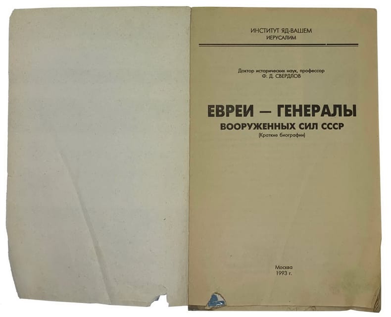 In Russian. Short description: F.D. Sverdlov. Jewish Generals of the Armed Forces of the USSR. Jerusalem, 1993. The decisive contribution to the defeat of Nazi Germany, which unleashed the Second World War, was made by the Armed Forces of the Soviet Union. A large role in this belonged to their highest command staff - Soviet generals and admirals. Therefore, the study of their biographies is of considerable historical interest. In the ranks of the Soviet army in World War II, about 450 thousand Jews fought in all branches of the military and in all positions and ranks - from privates to generals. They fought alongside the rest of the citizens of the Soviet Union, but more than that, they also knew that they were fighting an enemy who was destroying their people, who was waging war against the Jews. The combination of Soviet and Jewish patriotism greatly increased the consciousness of the Jews in the struggle against the German invaders. In this book, we will deal only with Jewish generals and admirals. The table of contents of the book simultaneously serves as a list of all Jewish generals and admirals of the Soviet Armed Forces. The appendices to the book contain lists of Jewish generals and admirals who held the most responsible positions: commanders of fronts (military districts), commanders of armies (flotillas), chiefs of staffs of fronts (fleets, districts), chiefs of staffs of frmies (flotillas), commanders of corps and divisions. Please feel free to contact us for a detailed description of the copies available. SKUMS002095