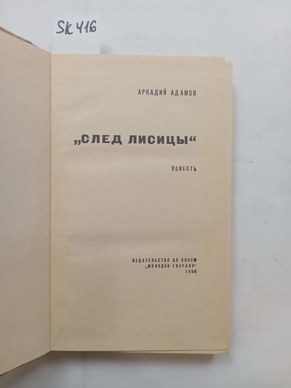 In Russian. Short description: Adamov, A., The Footprint of the Fox [Sled lisicy]. Leningrad: The Young Guard, 1966. Please feel free to contact us for a detailed description of the copies available. SKU lom-SK000416