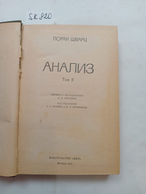In Russian. Short description: Laurent Schwarz, Analysis. Volume 2 [Analiz. Tom 2]. Moscow: World, 1972. Please feel free to contact us for a detailed description of the copies available. SKU lom-SK000820