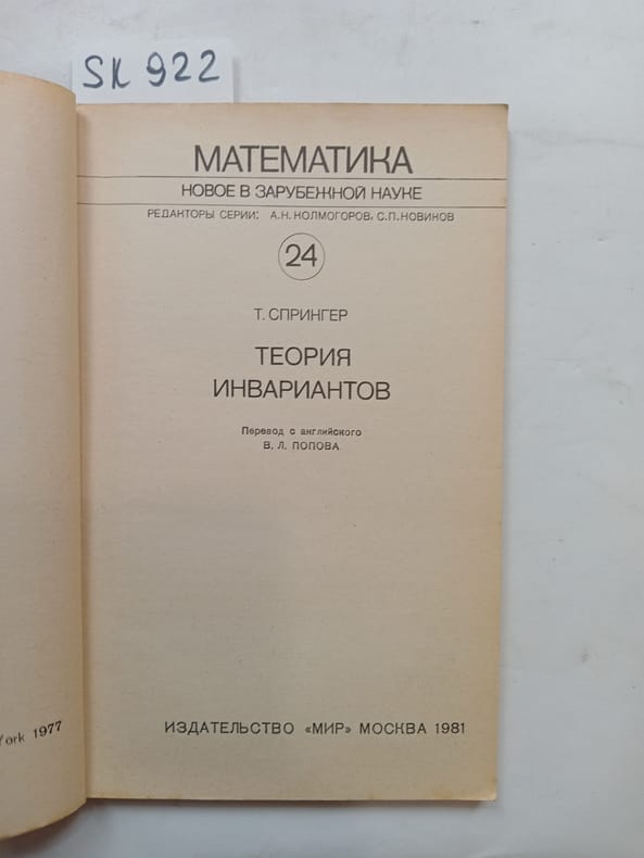 In Russian. Short description: Springer, T.,Invariant theory [Teoriya invariantov]. Moscow: World, 1981. Please feel free to contact us for a detailed description of the copies available. SKU lom-SK000922