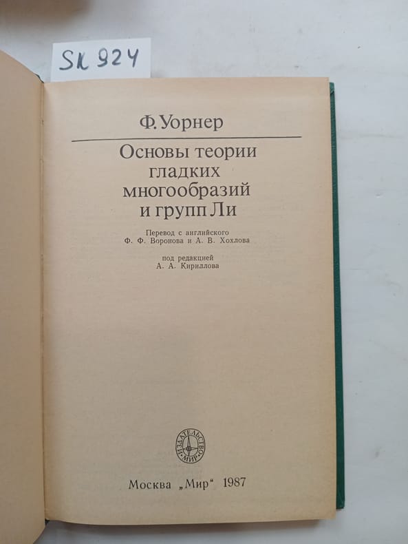 In Russian. Short description: Warner, F.,Fundamentals of Lee's smooth diversity and group theory [Osnovy teorii gladkih mnogoobrazij i grupp Li]. Moscow: World, 1987. Please feel free to contact us for a detailed description of the copies available. SKU lom-SK000924