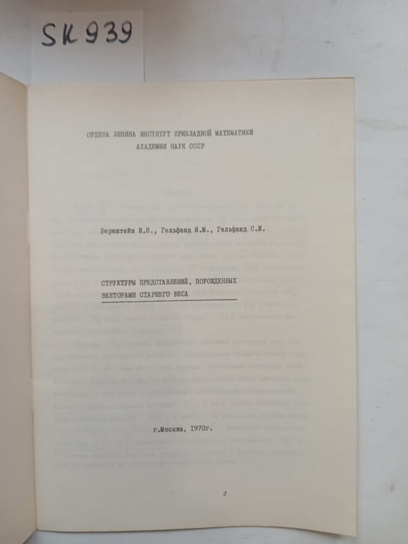 In Russian. Short description: Bernstein, I.N., Gelfand, I.M., Gelfand, S.I., Representation structures generated by older weight vectors [Struktury predstavlenij, porozhdennyh vektorami starshego vesa]. Moscow: , 1970. Please feel free to contact us for a detailed description of the copies available. SKU lom-SK000939
