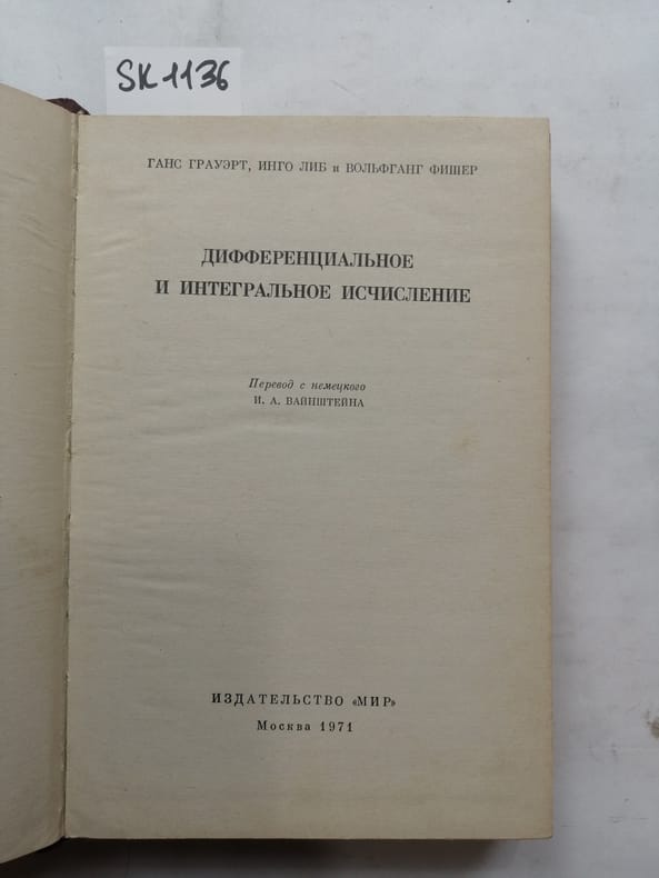 In Russian. Short description: Grauert, G, Lib, I., Fisher, W., Differential and integral calculus [Differencial'noe i integral'noe ischislenie]. Moscow: World, 1971 / , ., . . : , 1971. Please feel free to contact us for a detailed description of the copies available. SKU lom-SK001136