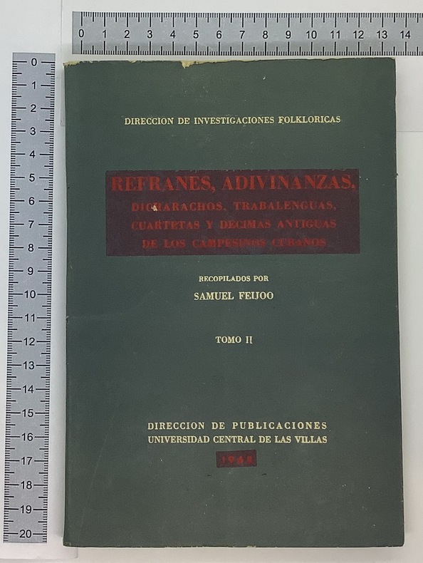 In Spanish. Short description: Refranes, adivinanzas, dicharachos, trabalenguas, cuartetas y decinas antiguas de los campesinos cubanos. Tomo II, Havana, 1962. Please feel free to contact us for a detailed description of the copies available. SKUZLO000141. Please feel free to contact us for a detailed description of the copies available. SKUZLO000141