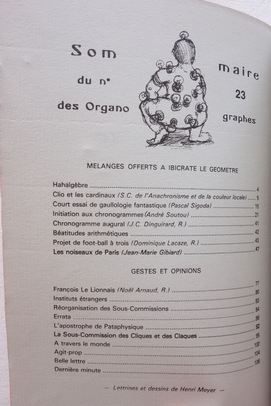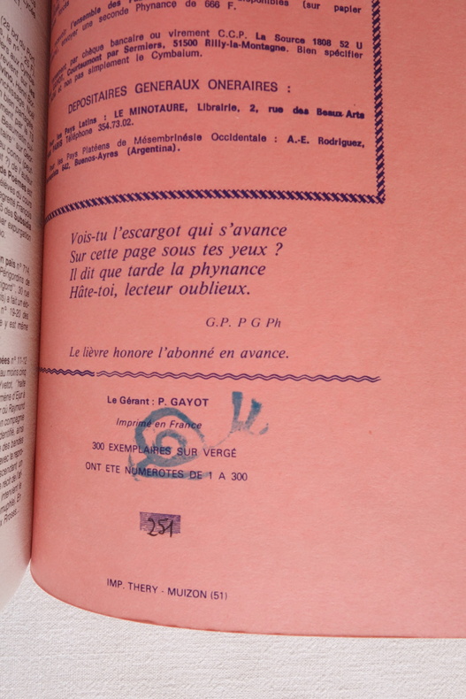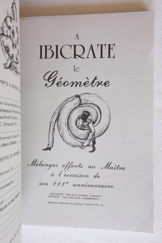 Mélanges offerts à Ibicrate le Géomètre - Organographes du Cymbalum Pataphysicum n° 23 - Collectif - Viridis Candela, Cahiers du Collège de 'Pataphysique, Quatrième & Nouvelle Série (25 juin 1984) In-8 broché (format 20,5 x 14,5cm) - 106 pp. - Édition originale - Tirage numéroté, un des 300 exemplaires sur vergé (n° 251 pour le notre) - Tampon de rappel de paiement d'abonnement, en forme d'escargot, au colophon Numéro en hommage à Ibicrate le Géomètre pour le 111ème anniversaire de son apparition dans le Livre VIII des Gestes et Opinions du Docteur Faustroll. Textes de Pascal Sigoda, André Soutou, Noël Arnaud, etc... Illustrations d'Henry Meyer. Exemplaire en très bel état, couverture propre, une légère plissure dans le coin inférieur du 1er plat, intérieur frais.