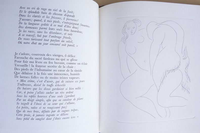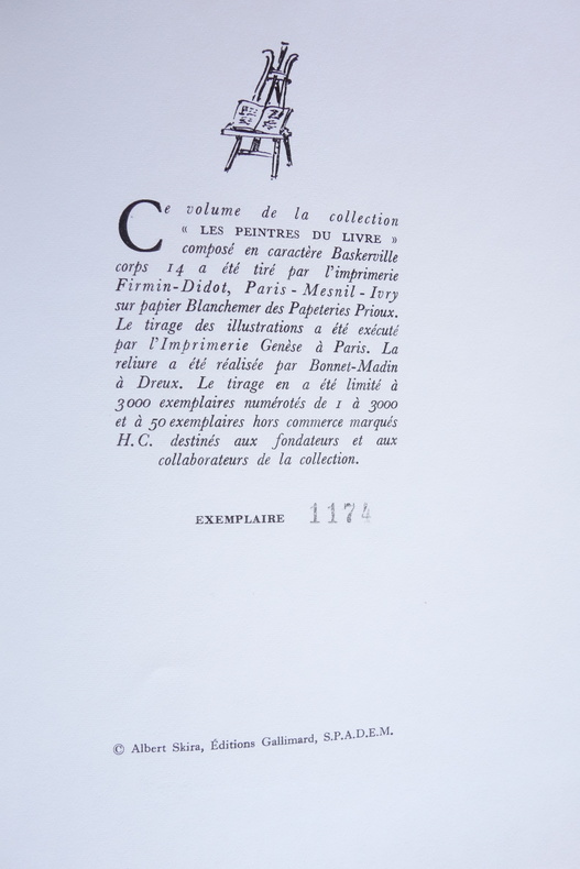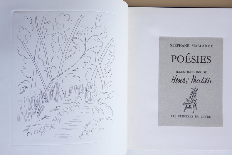 Stéphane Mallarmé - Poésies - Illustrations de Henri Matisse - Collection "Les Peintres du Livre" / Éditions L.C.L. 1966 Relié pleine toile (format 23 x 21,5) sous emboitage de l'éditeur - 1 frontispice et 16 illustrations hors texte - Tirage sur papier Blanchemer limité à 3000 exemplaires (n°1174 pour le notre) Ouvrage en bon état, dorure du titre légèrement estompée, couverture pleine toile en très bon état, intérieur frais. Emboitage bruni, légers frottements aux angles.