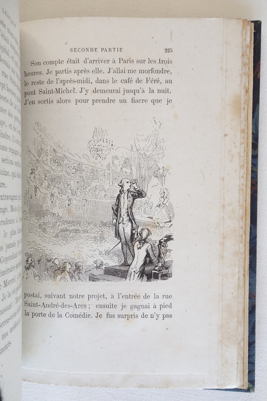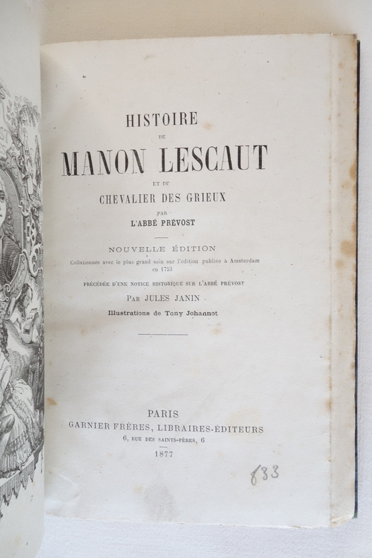 Histoire de Manon Lescaut et du chevalier des Grieux - Abbé Prévost - Nouvelle édition, précédée d'une notice historique sur l'Abbé Prévost par Jules Janin - Illustrations de Tony Johannot - Paris, Garnier Frères, Libraires-Éditeurs 1877 1 volume in-8 (format 19,5 x 13,5) - demi-reliure cuir, titrage doré au dos, plats et gardes de papier à la cuve, tranche de tête dorée - plats d'origine conservés - 220pp. - un des 100 exemplaires tirés sur papier de Chine (n°27 pour celui-ci) Bel exemplaire, couverture propre, très légers frottements au dos et aux coiffes, reliure solide, rousseurs sur la tranche, rousseurs éparses à l'intérieur.