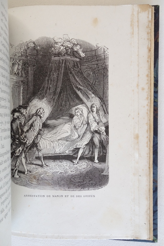 1 volume in-4 (26,5 cm x 16,5 cm), demi-maroquin rouge à longs grains à coins (reliure d’époque signée Thierry, successeur de Petit-Simier), dos lisse orné de motifs dorés, tête dorée. [4]-vii-1 bl.-xii-[2]-344 pages (complet). Claires rousseurs sur les gardes. Bon état. Nouvelle édition illustrée d’un frontispice, de 18 gravures hors-texte, ainsi que de nombreuses in-texte de Tony Johannot.L’Histoire du Chevalier des Grieux et de Manon Lescaut fait partie d’un ensemble plus vaste, Mémoires et aventures d’un homme de qualité. Des Grieux raconte comment la rencontre de Manon Lescaut a brisé son existence. Alors qu’il se destinait à devenir prêtre, un coup de foudre lui fait renoncer à tout : honneur, fortune, rang social. Pour elle, il va désobéir à son père, renier ses amis et connaître une totale déchéance. Manon est déportée en Louisiane pour ses mauvaises mœurs. Des Grieux va la suivre dans le Nouveau Monde… Ce roman est jugé immoral et frappé par la censure. Les deux jeunes héros, dont la passion amoureuse enfreint toutes les conventions et ruine leurs vies, apparaissent comme les victimes d’une société Bel exemplaire.