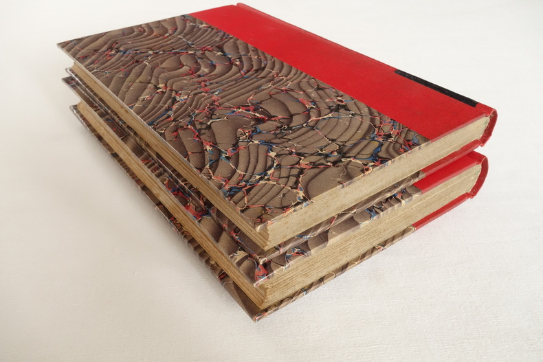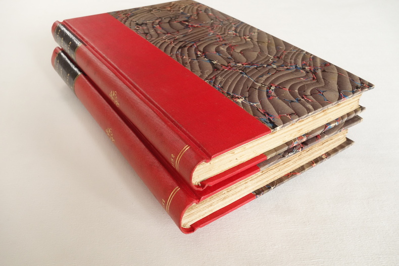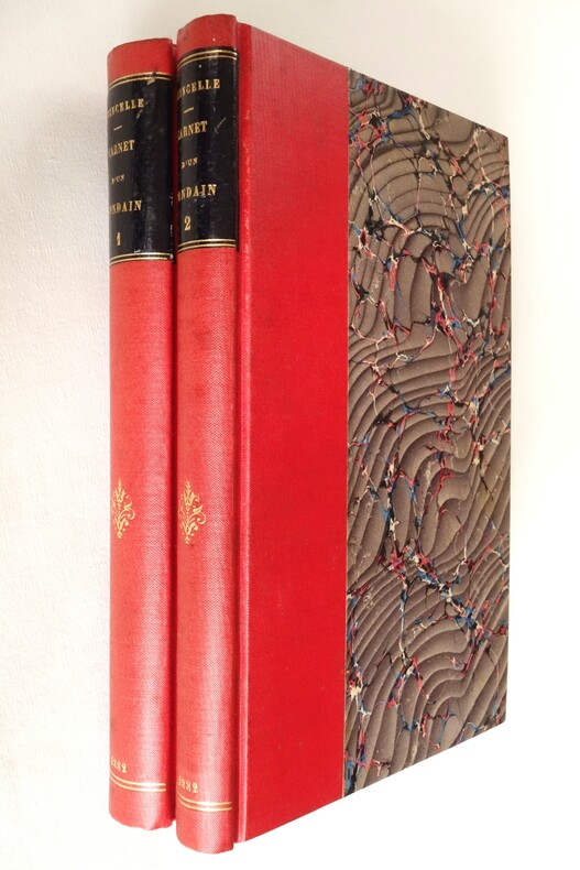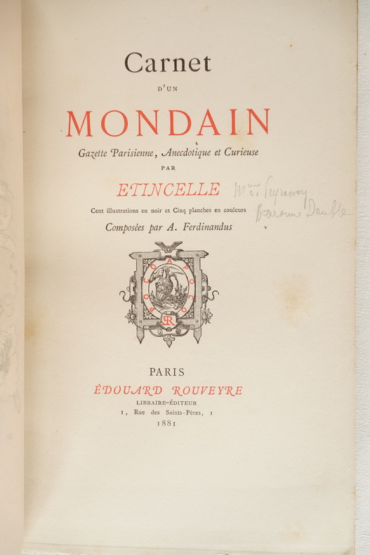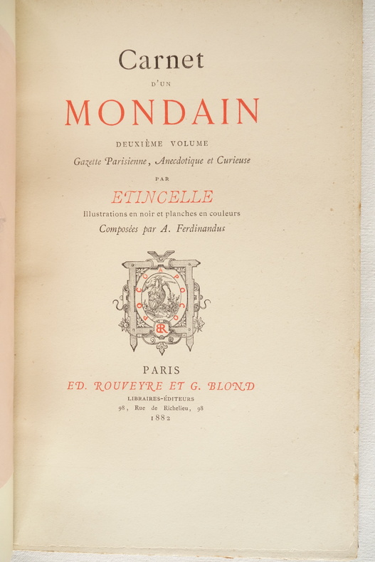 Carnet d'un mondain ; Gazette Parisienne, Anecdotique et Curieuse par Étincelle (pseudonyme de Mme de Peyronny / Comtesse Double) - 1ère année - Illustrations par A. Ferdinandus - Paris, Édouard Rouveyre, Libraire-Éditeur 1881 Carnet d'un mondain ; Gazette Parisienne, Anecdotique et Curieuse par Étincelle - 2ème année - Illustrations par A. Ferdinandus - Paris, Éd. Rouveyre et G. Blond, Libraires-Éditeurs 1882 2 volumes in-8 (format 21 x 14) - demi-percaline rouge à la Bradel, plats de papier à la cuve, titre, fleuron, date et double filets dorés au dos - plats d'origine conservés pour les 2 volumes - VIII, (1) ff., 182 pp. - 164 pp. - éditions originales Exemplaires en bon état, légères salissures aux dos, reliures solides, rousseurs aux tranches, rousseurs à l'intérieur du 1er volume, intérieur frais pour le second volume.