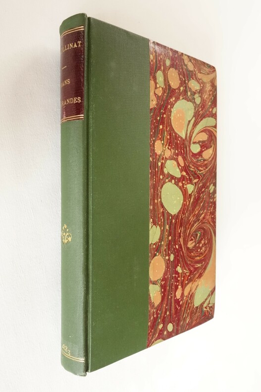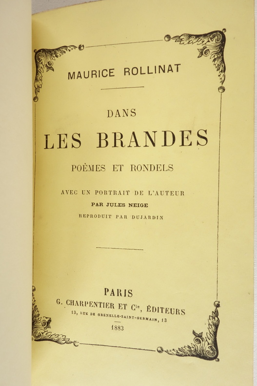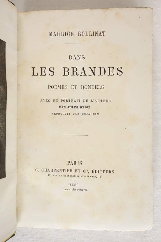 Dans les brandes ; Poèmes et rondels - Maurice Rollinat - Avec un portrait de l'auteur par Jules Neige - Paris, G. Charpentier et Cie, Éditeurs 1883 1 volume in-12 (format 19 x 12,5) - demi-percaline verte à la Bradel, plats de papier à la cuve, titre, fleuron, date et filet dorés au dos - 2 ff., 281 pp. - plats d'origine conservés - nouvelle édition illustrée d'un portrait de l'auteur en frontispice Exemplaire en bon état, petits tassements et frottements aux coins et aux coiffes, reliure solide, rousseurs. Pages en partie non coupées.