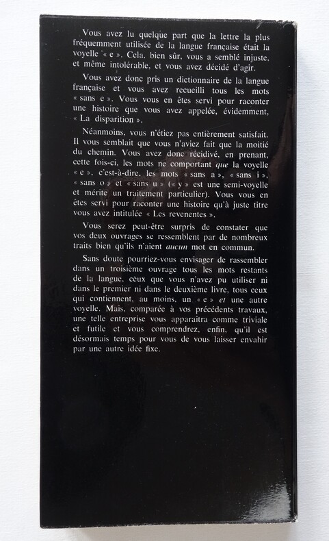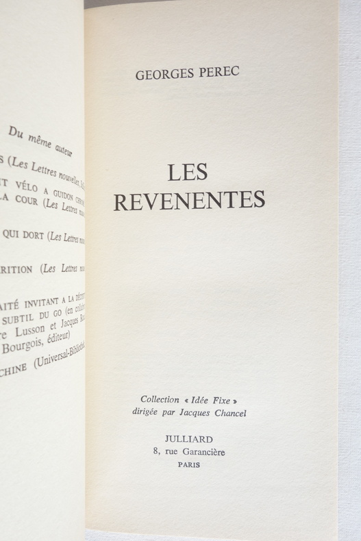 Les revenentes - Georges Perec - Collection "Idée Fixe" / Julliard 1972 1 volume broché format 11 x 21 - couverture souple à rabats - 126 pp. - Édition originale (sans grands papiers) Exemplaire en très bel état, couverture à rabats propre et brillante, légers frottements aux coiffes, intérieur frais.