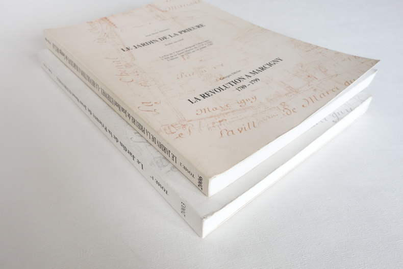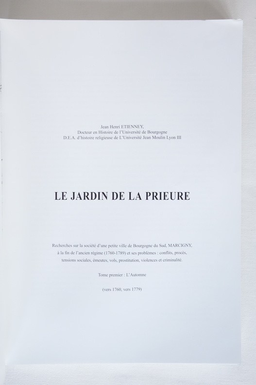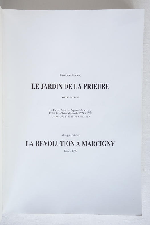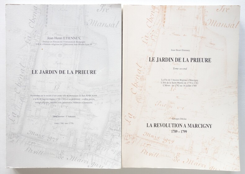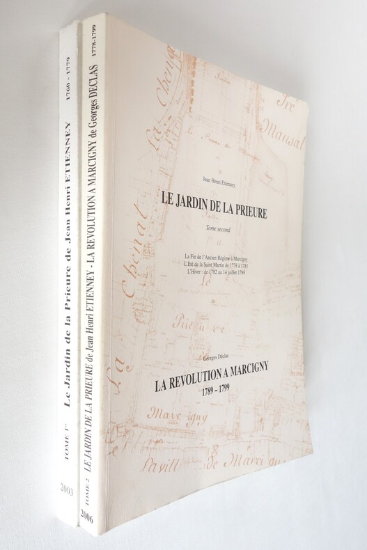 Le Jardin de la Prieure - Tomes 1 et 2 - Jean Henri Etienney 2003 / 2006 Tome premier : L'Automne (vers 1760, vers 1779) Recherches sur la société d'une petite ville de Bourgogne du sud, MARCIGNY, à la fin de l'ancien régime (1760 -1789) et ses problèmes : conflits, procès, tensions sociales, émeutes, vols, prostitution, violences et criminalité. Tome second : La fin de l'Ancien Régime à Marcigny - L'été de la Saint Martin de 1778 à 1781 - L'hiver : de 1782 au 14 juillet 1789 Suivi de La Révolution à Marcigny 1789-1799 par Georges Déclas 2 volumes format 21 x 29,5 - brochés, couvertures souples - 272 pp. et 275 pp. Ouvrages en bel état, légères marques d'usage aux plats, couvertures propres (une petite tache au 4e plat du tome 2), reliures solides et intérieurs frais.