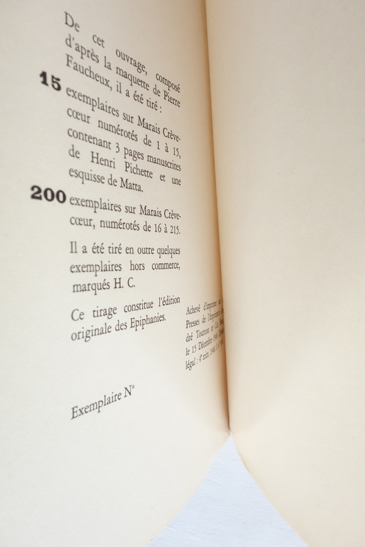 K éditeur, 1948. In-8 br. Maquette de Pierre Faucheux. Les Epiphanies ont été représentées pour la première fois le 3 déc. 1947, avec G. Philippe, R. Blin, M. Casarès, etc. devant des toiles de fond de Matta et une musique de Maurice Roche. Mise en scène de Georges Vitaly. E.O. ex. num. sur Marais Crevecoeur.