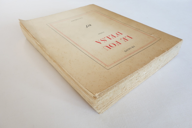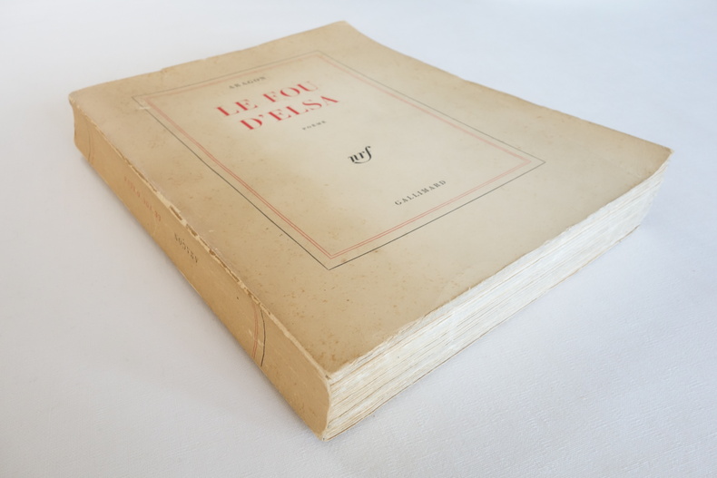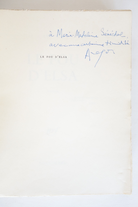 Le Fou d’Elsa - Louis Aragon - Gallimard 1963 1 volume broché format 19 x 23,5 - couverture souple - 458 pp. - 1ère édition sur papier courant - envoi autographe de l'auteur en page de faux-titre État correct, couverture défraichie (dos bruni et plissé, rousseurs aux plats, fente au bord supérieur du 1er plat et plissures dans le coin inférieur), reliure toujours solide et intérieur frais.