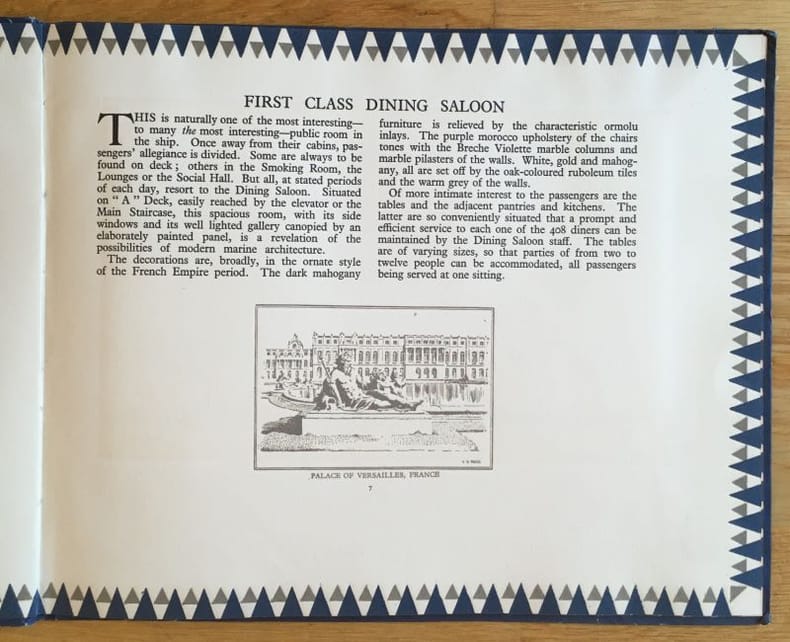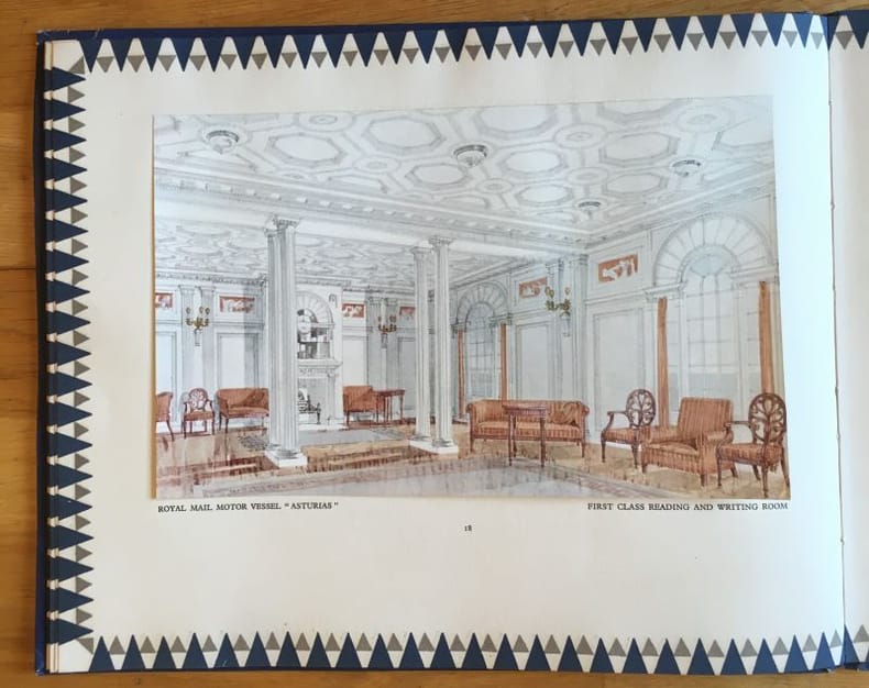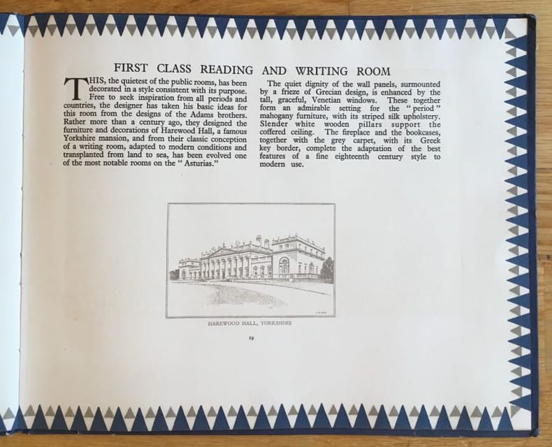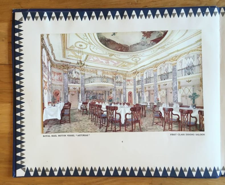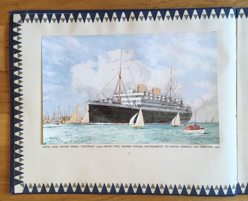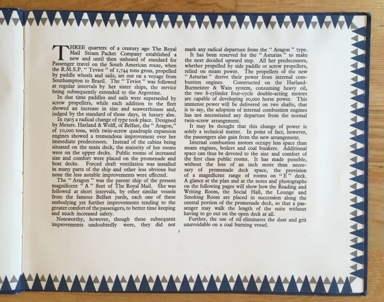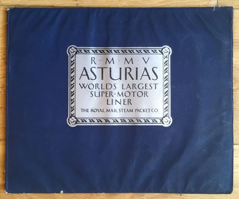 Rare plaquette de luxe présentant le paquebot « Asturias », l'un des fleurons de la Royal Mail Steam Packet Company. Construit par les chantiers nord-irlandais Harland & Wolff de Belfast (comme le Titanic), il fit son voyage inaugural le 24 janvier 1908 à destination de l'Australie via Suez. Il assura ensuite la liaison entre Southampton et la côte Est de l'Amérique du Sud, avant d'être converti en navire-hôpital pendant la première guerre mondiale. Outre une présentation technique, ce document révèle les plus belles pièces de la « First Class » : la salle de bal, la salle à manger (au décor inspiré du château de Versailles), le jardin d'hiver, la piscine... Menus frottements aux extrémités.