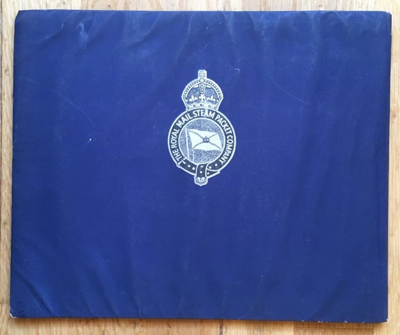 1907 London, The Royal Mail Steam Packet Co, [circa 1907] ; plaquette in-4 oblong (255 x 310 mm) de [12] ff., couverture bleu marine, titre et logo en noir sur fond argenté.