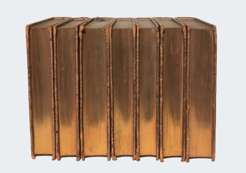1785 Paris: P. D. Brocas [puis] J. Barbou, 1769-1789. Texte complet en 6 vol. in-12: 10.5 x 17.5 cm. I(1785)/ xl-500 pp.; II(1780)/ 456 pp.; III(1774)/ 432 pp.; IV(1781)/ 475-[5] pp.; V(1789)/ 535 pp.; VI(P. D. Brocas: 1769)/ 534-[2] pp. Edition des 35 livres de l'"Histoire de Rome" faite sur l'édition "très estimée" de Crevier (1735). (Quérard, IX et Brunet, III). Reliures d'époque en plein veau. Dos à 5 nerfs, pièce de titre sur maroquin rouge. Reliure un peu frottée mais solide. Envoi de photographies sur demande.