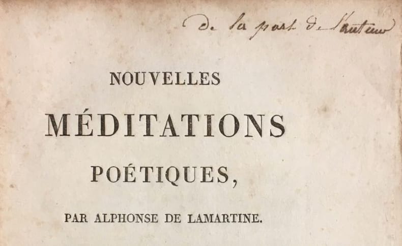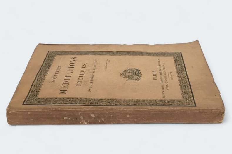 1 vol. in-8 reliure romantique époque Restauration demi-veau à petits coins noir, dos estampé à froid à 4 nerfs plats, Méditations Poétiques, A la Librairie Grecque-Latine Allemande, Chez Henri Nicolle, Paris, 1820, 2 ff., 156 pp. [Avec : ] Nouvelles Méditations Poétiques, Urbain Canel, Audin, Paris, 1823, 2ff., ii-179 pp. [ Avec : ] La Mort de Socrate, Poëme par A. de Lamartine, Chez Ladvocat, Paris, 1823, 1 f., pp. 10-146 [ Avec : ] Sur le Dévouement de Pierre Desse, commandant le Brock Français La Julia, par M. Edouard Delprat, Imprimerie et Fonderie de J. Pinard, Paris, 1824, 2 ff., frontispice, 15 pp. [ Avec : ] Epitre à M. A. de Lamartine par M. Casimir Delavigne, Chez LAdvocat, Paris, 20 avril 1824, 3 ff., 1 f. blanc et 14 pp. [ Avec : ] Défense de Louis XVI, prononcée à la Barre de la Convention le mercredi 26 décembre 1792 par M. Desèze, l'un de ses défenseurs officieux, Chez Bloquel, à Rouen, 1824, frontispice, 1 f., 49 pp. [ Avec : ] Mon Agonie de trente-huit heures, ou Récit de ce qui m'est arrivé, de ce que j'ai vu et entendu, pendant ma détention dans la prison de l'Abbaye St-Germain, depuis le 22 août jusqu'au 4 septembre 1792 par Jourgniac St-Méard, dix-septième édition entièrement conforme à celle imprimée à Paris chez Dessenne en 1792, Chez Pierre Beaume, Bordeaux, s.d., 56 pp. [ Avec : ] Tableau périodique et raisonné des Opérations de l'Assemblée Nationale, depuis l'origine de la Monarchie, jusqu'à l'Assemblée Nationale actuelle, par M. l'Abbé Raynal, A Marseille, réimprimé à Paris, Chez Gueffier jeune, 1790, 40 pp. [ Avec : ] Notice sur Jean-Baptiste Colbert, né à Reims le 29 août 1619 mort à Paris le 6 septembre 1683, extrait de la Revue Encyclopédique juin 1822, 18 pp. [ Avec : ] Notice Historique sur J. B. Viotti par M. Miel, extrait de la biographie universelle, tome XLIX, 14 pp.