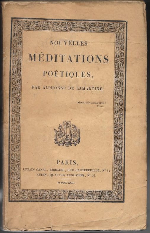 Paris Charles Gosselin Urbain Canel et Chez Audin 1824 in-8 plein-veau 2 oeuvres reliées en 1 volume, reliure plein veau havane marbré grand in-octavo (binding full calfskin in-octavo) (12,8 x 20,2 cm), RELIURE D'EPOQUE, dos long (spine without raised bands), décoration or (gilt decoration) à filets et roulettes or (gilt lines and fillets), entre-nerfs à fleuron or (between the raised bands floweret), titre frappé or (gilt title), pièce de titre sur fond vert foncé (label of title) avec un filet large or (label of title with gilt line), filet large or avec de part et d'autre un filet fin or, un filet large or et une roulette or en place des nerfs et en tête et en pied, dos légèrement frotté, coiffe supérieure trés légèrement fendue, plats décorés or (gilt decoration) d'un encadrement d'un filet or et d'une roulette or, roulette or sur les coupes (gilt fillets on the cuts) avec légers manque de dorure (blurred gilding), tête lisse (top edge smooth), toutes tranches lisses (all smooth edges), jaspées bleues et rose (all blue and roses marbled edges), Exemplaire sous agréable reliure du temps. MEDITATIONS POETIQUES : Il s'ouvre sur une jolie page de titre avec large vignette figurative signée de Rose. Il s'agrémente en outre de 3 figures à pleine-page en noir de Desenne + 27 vignette in-texte en noir. La préface de Nodier paraît ici pour la première fois, mention de 11 ème Edition, 262 pages, 1824 Paris, Charles Gosselin Editeur + NOUVELLES MEDITATIONS POETIQUES : sans illustrations, mention de 2ème Edition, 236 pages, 1824 Paris Chez Urbain Canel /Chez Audin Editeurs,