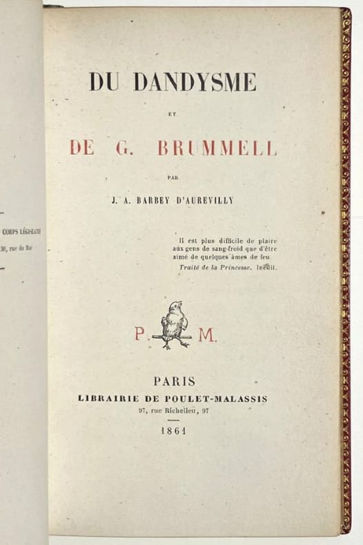 Rare édition originale de ce texte célèbre de Barbey dAurevilly, son troisième livre publié. Cet écrit retrace la vie du Beau Brummell (1778-1840) et Jules Barbey d'Aurevilly y défend l'éclat et la grâce du dandysme. Les excentricités de Brummell sont connues : lustrer ses bottes avec du champagne, par exemple, ou utiliser un crachoir en argent, car il ne concevait pas de cracher par terre. Son rituel de toilette pouvait occuper une grande partie de la matinée, car il passait des heures à essayer différents nuds de cravate dans le seul but de donner limpression de lavoir nouée en un tour de main. Le roi George IV, protecteur de Brummell pendant un certain temps, avait assisté à ce rituel matinal du « Pétrone » londonien. Le tirage de ce livre était estimé par Carteret et Vicaire à une trentaine d'exemplaires plus quelques ex. sur Hollande et sur papier de couleurs mais il a été réévalué à 250 exemplaires. Néanmoins très rare originale en belle condition. Vicaire, Carteret.