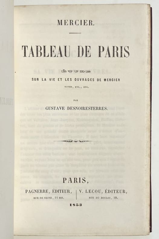 Réédition savante de la première version du Tableau de Paris, avec une étude sur la vie et les ouvrages de Mercier par Gustave Desnoiresterres, spécialiste du XVIIIe siècle. Très bon exemplaire, bien relié à l'époque.