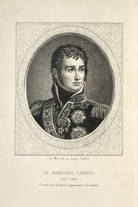 Biographie du Maréchal Lannes ( originaire de Lectour dans le Gers), donnée par le nivernais Poussereau. Jean Lannes, épousa en 1800, Louise Antoinette Guéheneuc, fille de l'administrateur des forêts, à Dornes, en Nivernais. ( S2)
