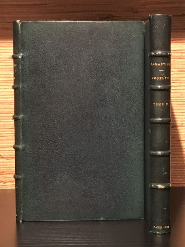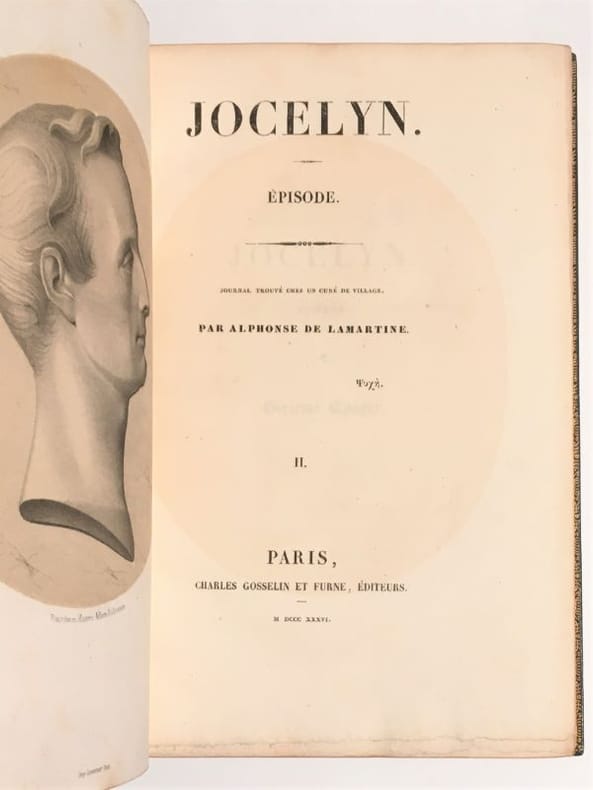 Première édition illustrée et premier tirage, dite édition "Keepsake", en partie originale, comportant 12 planches (frontispice compris) hors texte d'après Marckl, gravées sur bois par Quartley, Dujardin, Herbert, Piaud et Timms, vignettes sur bois dans le texte, et 10 titres-frontispices compris dans la pagination (Carteret III, p. 366 ; Vicaire, IV, 976-77; Talvart XI, 19E) — L'édition originale (non illustrée) date de 1836. – Jocelyn, poème de Lamartine, est le journal et la confession d'un prêtre. Jocelyn est entré au séminaire afin de pouvoir abandonner à sa soeur sa part d'héritage et lui permettre d'épouser l'homme qu'elle aime. Les événements de 1793 l'obligent à se réfugier dans une grotte solitaire des Alpes. Un émigré, poursuivi par les soldats, meurt dans la montagne en confiant à Jocelyn son fils Laurence. Les deux jeunes gens vivent dans les bois, pleins de santé et de bonheur, attirés l'un vers l'autre par de vagues désirs. Enfin, Jocelyn découvre que Laurence est une femme, et une femme qui l'aime tendrement. Un jour, Jocelyn est appelé auprès de son évêque, prisonnier et mourant. Le vieillard lui confère les ordres, afin de pouvoir se confesser à lui. Une soeur de charité va annoncer à Laurence le sacrifice de Jocelyn. Deux années se passent. Jocelyn est devenu curé de Valneige. Après avoir longtemps souffert, il a conquis la paix du coeur. Laurence, pour s'étourdir, s'est jetée dans les plaisirs du monde. Quelques années après, elle vient mourir dans la montagne où elle a vécu heureuse, et c'est Jocelyn qui reçoit sa confession. L'amour, à la fois ardent et chaste, des deux jeunes gens, la grandeur du sacrifice chez Jocelyn, la sérénité où son âme arrive à la fin, les descriptions de la nature amples et abondantes, une pensée philosophique élevée côtoyant parfois une poésie intime et familière, des épisodes de toute beauté comme ceux des Laboureurs, de I'ordination de Jocelyn, des funérailles de Laurence, tels sont les principaux mérites de cette oeuvre. (Imago Mundi)