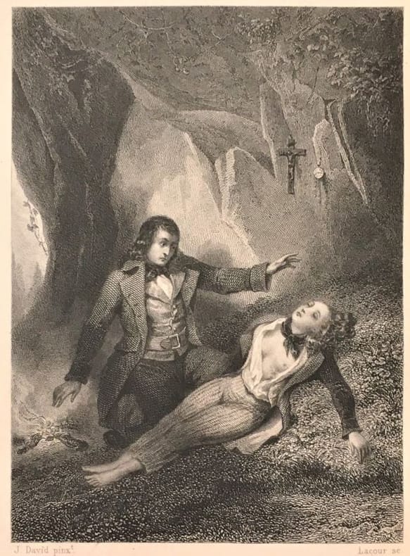 Édition originale. BEL EXEMPLAIRE EN PLEINE RELIURE DE CUZIN, enrichi d'un frontispice allégorique tiré sur Chine appliqué au tome I, d'un portrait en médaillon sur fond teinté au tome II et de 2 figures sur papier vélin fort. Il provient de la riche bibliothèque d'Eugène Paillet (1829-1901), président des Amis des livres, avec ex-libris manuscrit (cat. 1887, n° 432 et Bulletin Morgand, février 1887, n° 12157). Ex-libris Laurence Currie (1867-1934). Légers frottements au dos, transfert des gravures sur les feuillets en regard. Vicaire, IV, col. 975 (cite cet exemplaire, le plus coté). Carteret, Romantiques, II, p. 24.