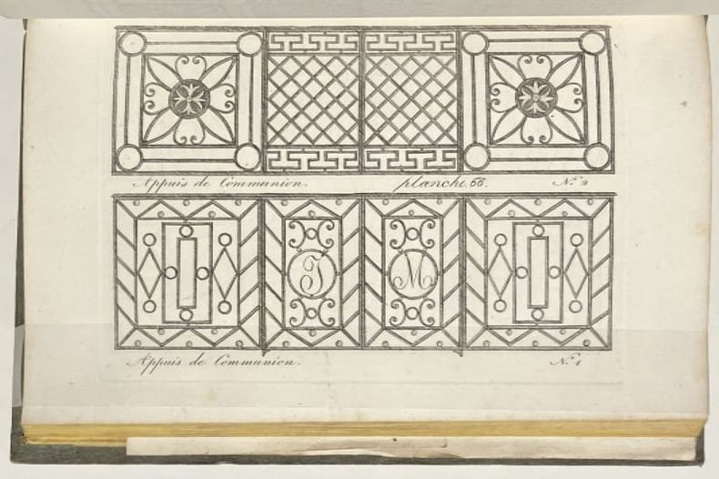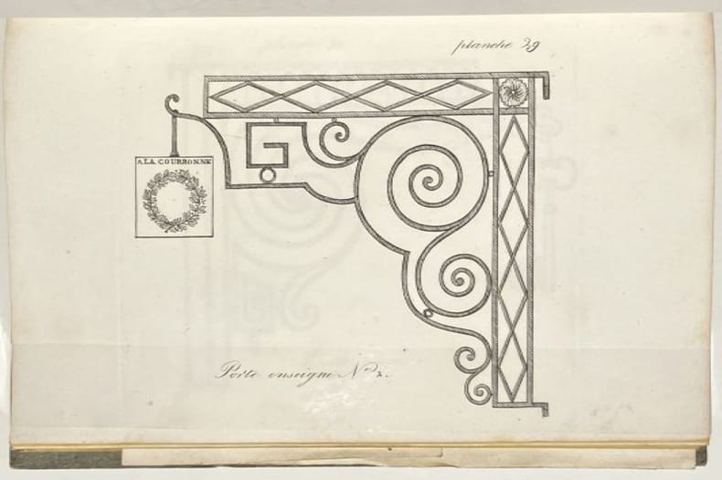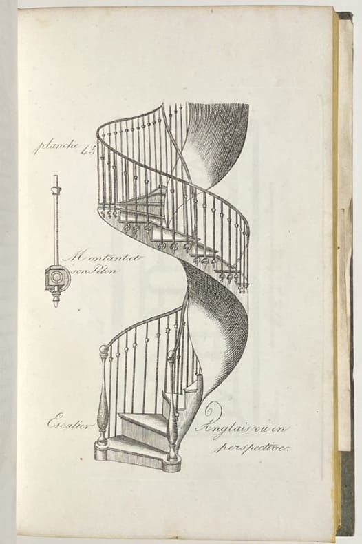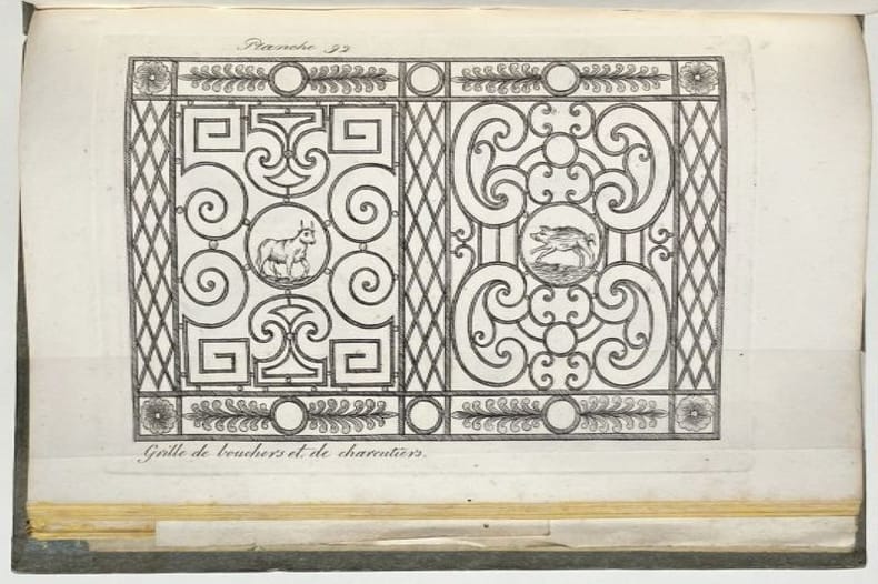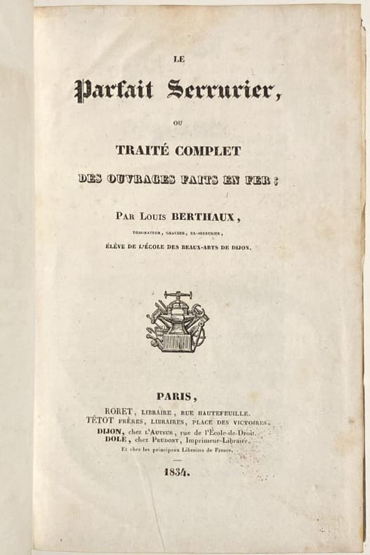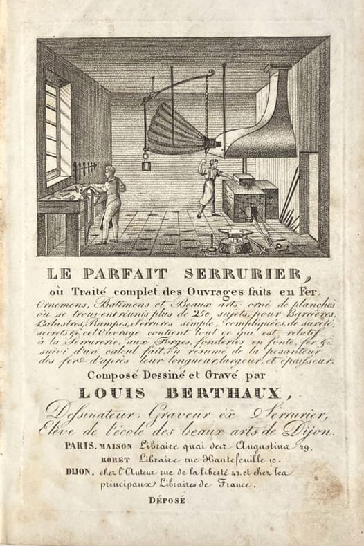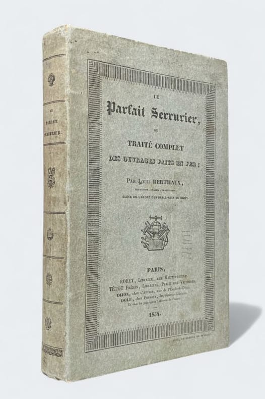 Deuxième édition de ce manuel de serrurerie et de ferronnerie, qui fut une référence tout au long du XIXe siècle. Il est illustré d'un beau titre-frontispice gravé en taille-douce et de 114 planches, présentant différents mécanismes de serrure et de nombreux ouvrages forgés : poignées, porte-enseignes, impostes, rampes, balcons, grilles, etc. La dernière planche, dépliante, montre un chef d'oeuvre de compagnon exécuté à Marseille en l'an 1809 par Ange le Dauphiné. Très bon exemplaire conservé non coupé dans son cartonnage d'éditeur, condition rare pour ce type d'ouvrages techniques. Cartonnage un peu défraîchi, quelques rares rousseurs.