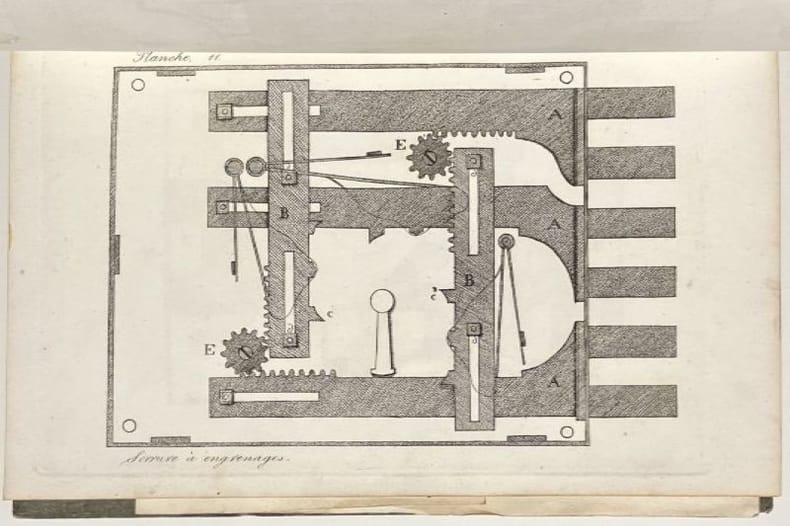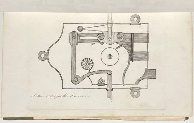 Exemplaire comprenant en outre 4 planches repliées : 2 de chariots à élévations et deux serrures secrètes à motif impérial. Bon état d’occasion