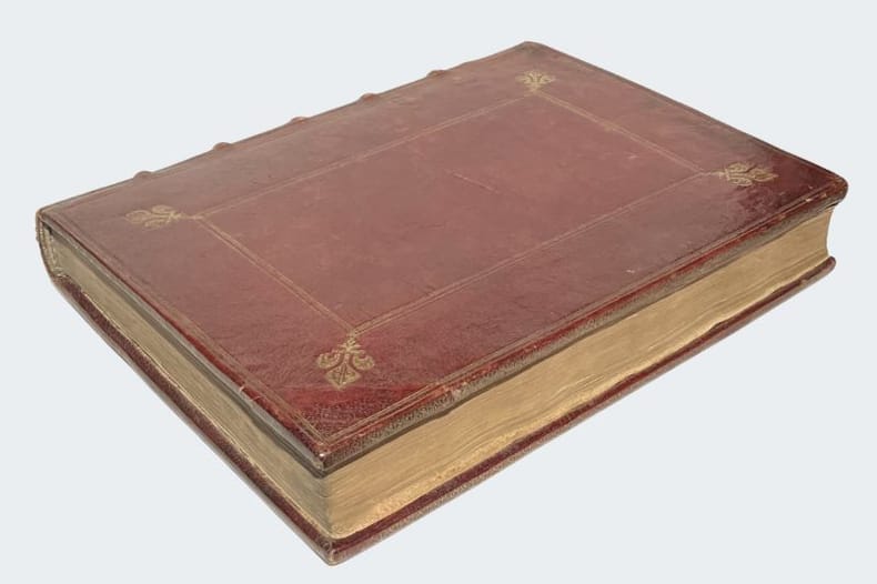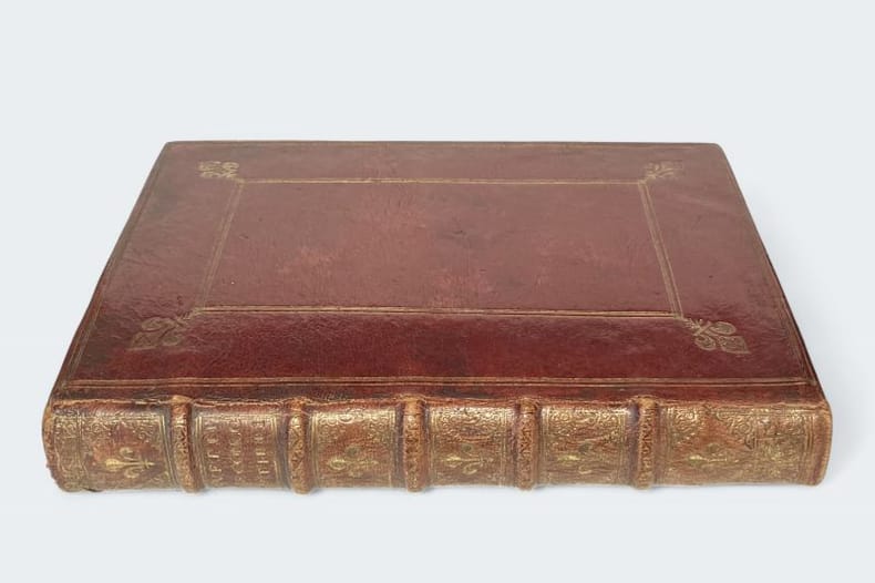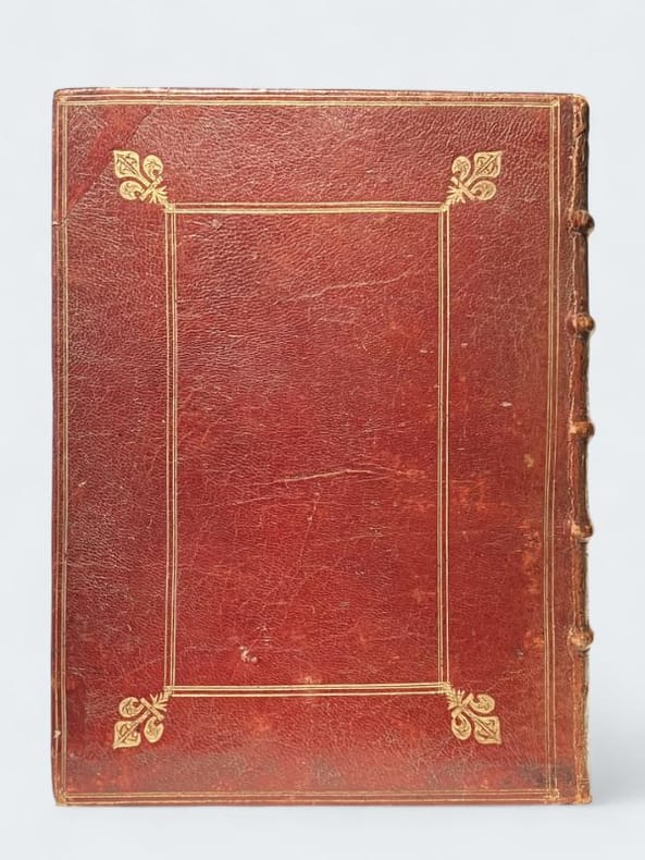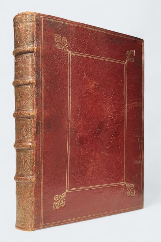 1690 Caen, Jean Cavelier et Paris, Thomas Moette, 1690 ; in-4 de [4] ff., 437 pp., [7] ff., maroquin vieux rouge, encadrement à la Duseuil sur les plats avec fleurs de lys aux angles, dos à nerfs orné de caissons fleurdelisés, roulette sur les coupes, tranches dorées (reliure de l'époque).