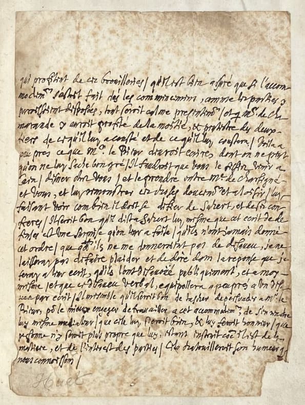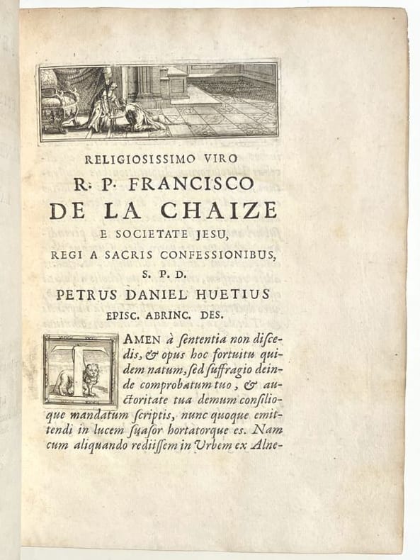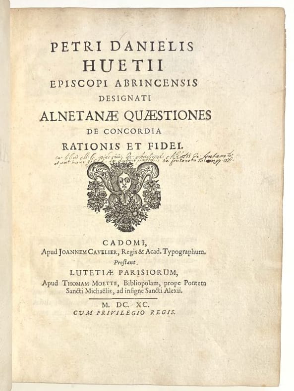 Édition originale de ce traité sur la foi et la raison. L'évêque d'Avranches cherchait, selon ses propres dires, « jusqu'à quelle hauteur l'esprit humain pourrait s'élever par ses propres forces et quel appui il devait emprunter à la foi ». L'ouvrage témoigne de sa grande érudition et de ses longues réflexions sur la tradition judéo-chrétienne, mais aussi d'un intérêt pour les religions non chrétiennes (cf. Guillaume Ducoeur, « Les religions indiennes comme argumentatio dans les Alnetanae quaestiones de Pierre-Daniel Huet », XVIIe siècle, 2013, n° 259, pp. 281-299). Précieux exemplaire relié en maroquin rouge à la Duseuil, portant l'EX-LIBRIS HÉRALDIQUE DE L'AUTEUR AU PREMIER CONTREPLAT. Il est enrichi d'une lettre autographe (partielle et inédite ?) de Huet adressée à son neveu, Jean-Baptiste de Piédouë de Charsigné, procureur général du bureau des finances de Caen (une page, avec l'adresse et le cachet armorié du destinataire au verso). Elle concerne les affaires de l'abbaye de Fontenay, en Normandie, et en particulier un différend qui l'opposait de longue date à M. de Chamarange au sujet de réparations à effectuer. Cette lettre n'est pas reproduite dans l'ouvrage d'Armand Gasté, Lettres inédites de P.-D. Huet, évêque d'Avranches, à son neveu, M. de Charsigné (1901), qui en recueille plusieurs centaines retrouvées dans la maison natale de l'auteur, à Caen. La bibliothèque de Pierre-Daniel Huet (1630-1721) était réputée l'une des plus belles de son temps. Il la légua avant sa mort, en 1692, à la maison professe des Jésuites de Paris. Après la suppression de la Congrégation de Jésus en 1762, l'ensemble des collections des Jésuites fut inventorié pour être vendu mais l'héritier de Huet, Michel-Gabriel Piedouë de Charsigné (vers 1705-1775), qui avait poursuivi le travail de son grand-oncle à Fontenay, obtint la restitution de la bibliothèque. Le volume porte son ex-libris manuscrit sur le titre, suivi d'un autre, ajouté en 1776 par un prêtre de Fontenay. Ex-libris moderne Gosselin, de Caen. Dos passé et frotté, restauration ancienne sur un angle. La première partie de la lettre semble manquer.