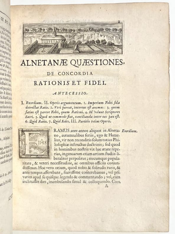 Édition originale de ce traité consacré au rapport de la Raison et la Foi. Elle est ornée d'une première vignette en tête de l'épître dédicatoire et d'une seconde en tête de l'introduction ainsi que de jolis lettrines et culs-de-lampe. Ex-libris manuscrit Thibeaud, daté de 1834, 1 étiquette de bibliothèque, tampon ex-libris de l'institut missionnaire Saint Augustin de Lormoy, au titre. * Membre du SLAM et de la LILA / ILAB Member. La librairie est ouverte du lundi au vendredi de 14h à 19h. Merci de nous prévenir avant de passer,certains de nos livres étant entreposés dans une réserve.