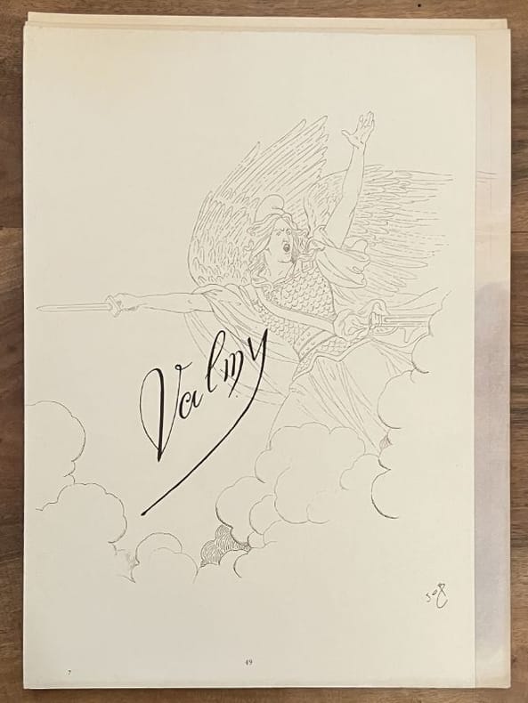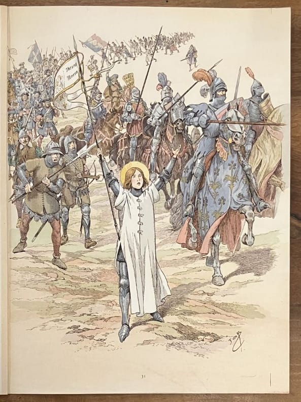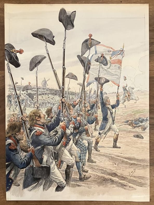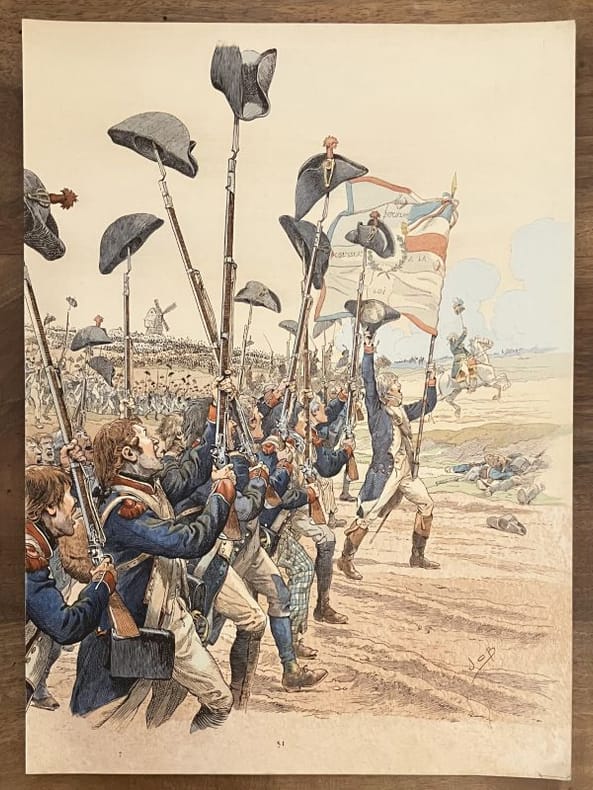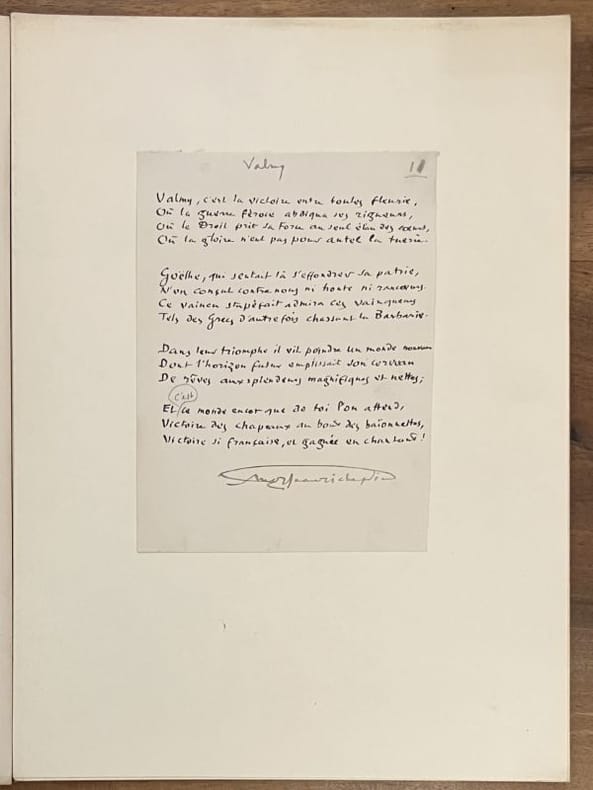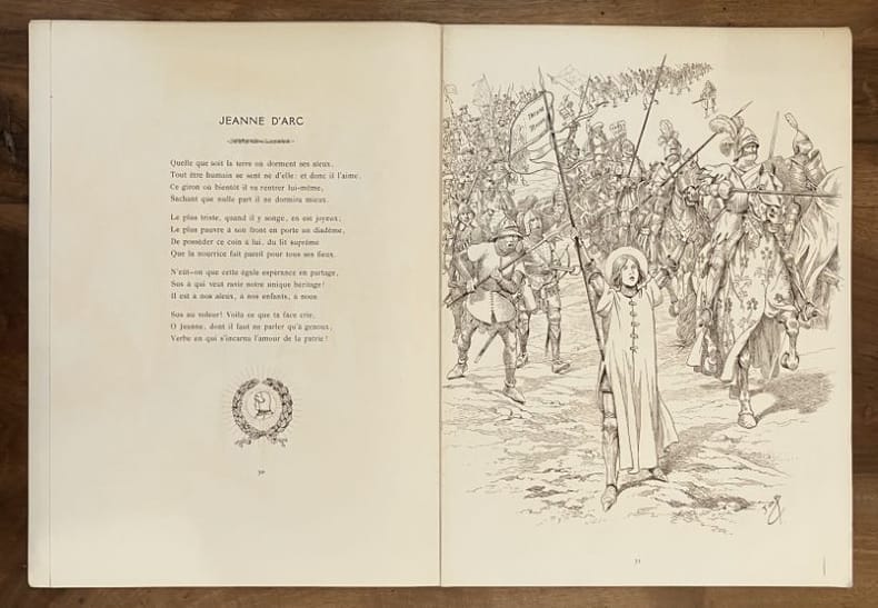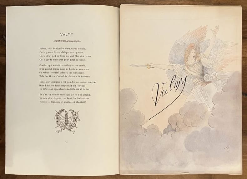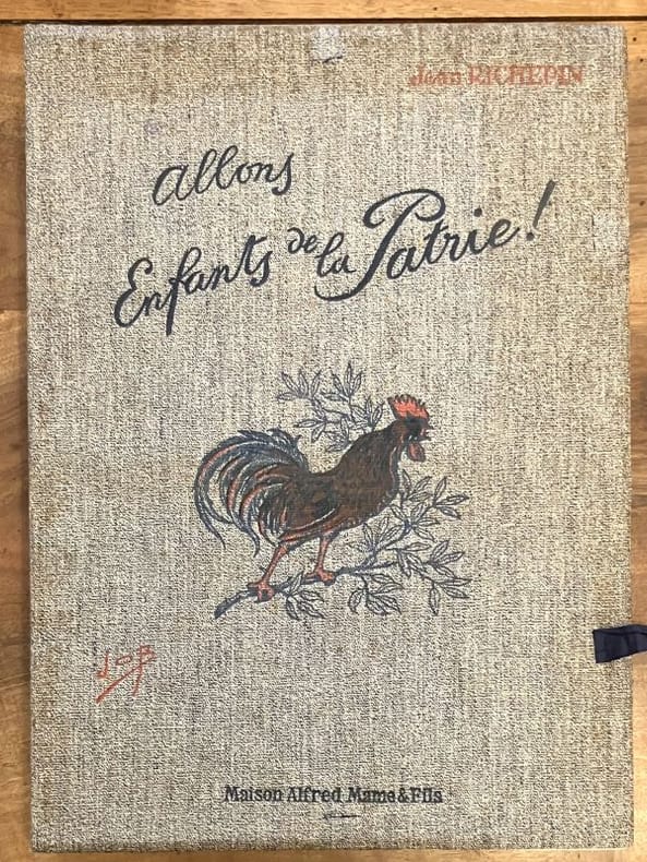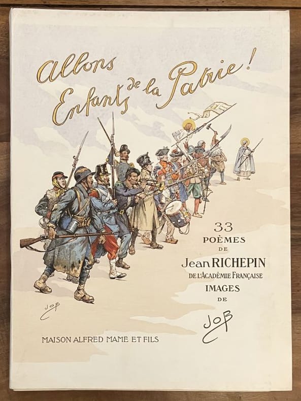 Édition originale et premier tirage de ces 33 poèmes patriotiques, illustrés par Job de 33 grandes compositions à pleine page. Un des 33 exemplaires de tête sur papier impérial du Japon (n° 11), comprenant une suite des illustrations en noir, un poème autographe signé de Jean Richepin et 2 GRANDES AQUARELLES ORIGINALES DE JOB pour la section Valmy. Chemise salie, un lacet manquant mais l'ouvrage est par ailleurs très frais.
