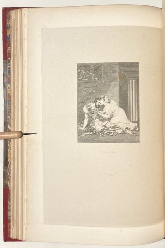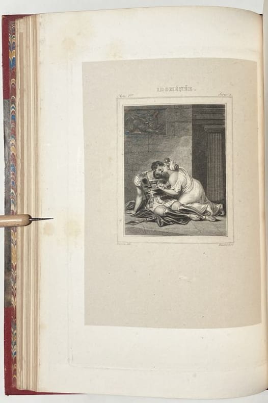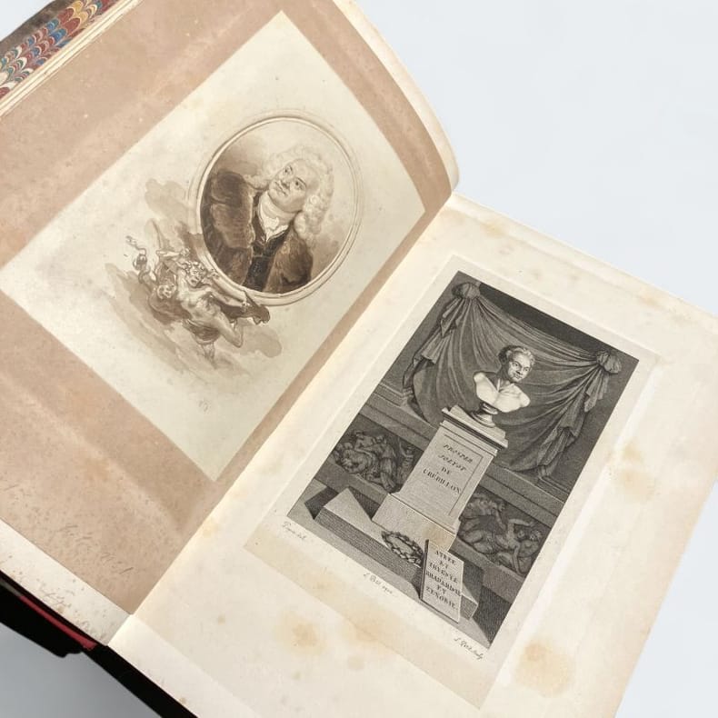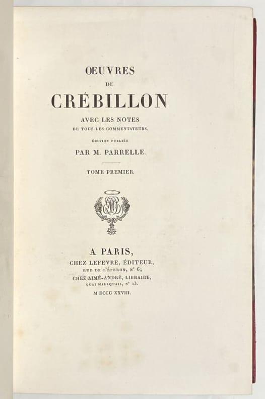 Belle édition dans la « Collection des classiques françois ». Elle a été préparée par Louis Parrelle et imprimée par Didot aîné. REMARQUABLE EXEMPLAIRE SUR GRAND PAPIER VELIN, enrichi de 98 figures hors-texte. Avec pas moins de 5 cycles d'illustrations des XVIIIe et XIXe siècles, cet exemplaire permet d'admirer le travail des principaux artistes ayant illustré l'oeuvre de Crébillon. Il comprend : — 7 JOLIS DESSINS ORIGINAUX DE DEVERIA à la sépia, dont le portrait de Crébillon, avec leurs gravures sur chine avant la lettre et les eaux-fortes pures ; 1 gravure en double état, sans le dessin. — La suite de Marillier, état avec la lettre grise et le titre de la pièce au-dessus : un portrait et 9 figures gravées par Dambrun, Ingouf, Macret et Trière. — La suite de Peyron sur chine avant la lettre : un portrait et 9 figures gravées par Bacquoy, Hubert, Le Petit, Le Mire, Patas, Thomas et Trière, dont 8 avec les eaux-fortes pures. — La suite de Moreau sur chine avant la lettre, avec les eaux-fortes pures : 9 figures gravées par Bosq, Delvaux, Ribault et Simonet. — La suite de Monnet avant la lettre : un portrait et 9 figures gravées par Delignon. — Plusieurs beaux portraits de Crébillon, dont celui gravé par Ficquet en épreuve grande de marge et remontée, celui de Saint-Aubin sur chine (qui accompagne la suite de Moreau), deux portraits de Louis XV, un portait de Madame de Pompadour et diverses figures... Ex-libris d'Emmanuel Martin (1821-1882), grand amateur de littérature, qui truffait ses exemplaires avant de les confier au relieur Charles Capé. Il avait devancé, dans son goût pour l'illustration du XVIIIe siècle, les fastueux bibliophiles que furent les Goncourt, le baron Portalis ou Henri Beraldi. La collection complète des « Classiques françois » était l'un des fleurons de sa bibliothèque (cf. sa vente, 1877, n° 604). Épidermures aux extrémités, rousseurs sur une ou deux figures ajoutées.