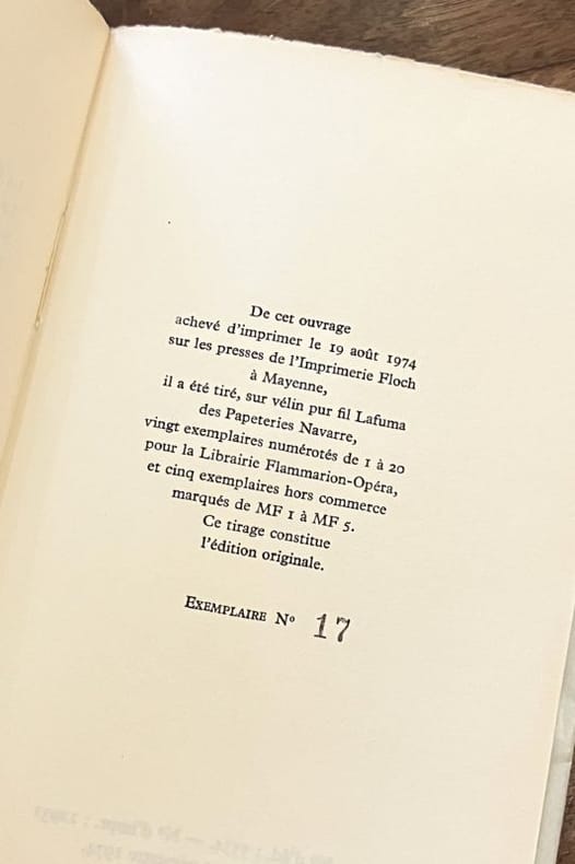 Edition originale. 1/25 exemplaires numérotés sur vélin pur fil Lafuma(et dans ce tirage 1 des 5 exemplaires hors commerce), seul grand papier. Bon exemplaire.