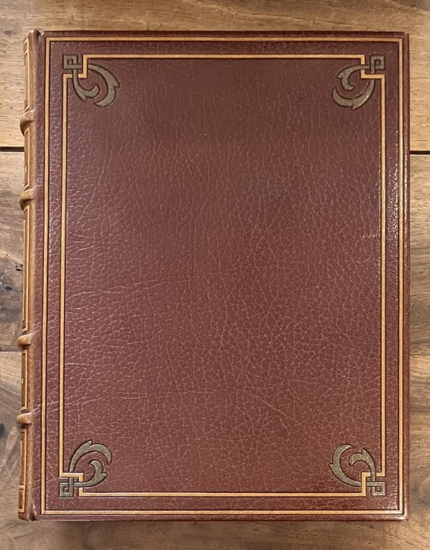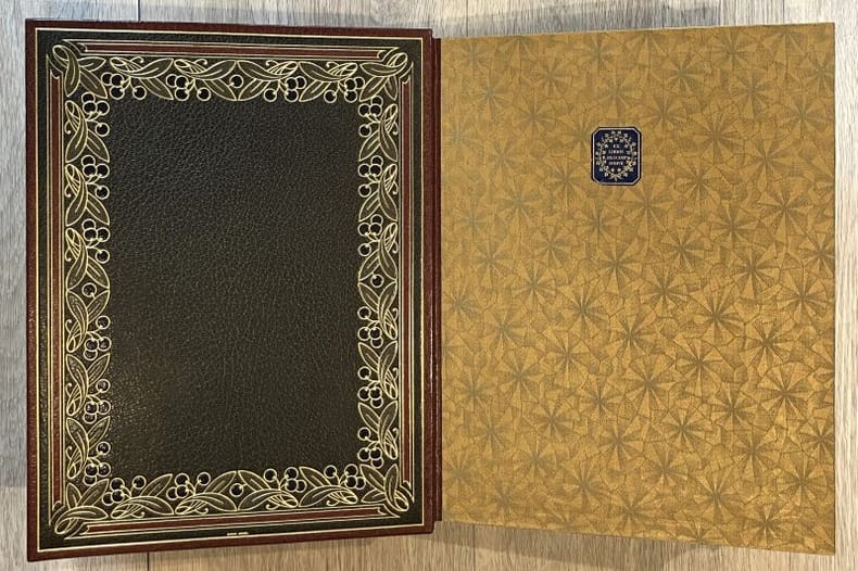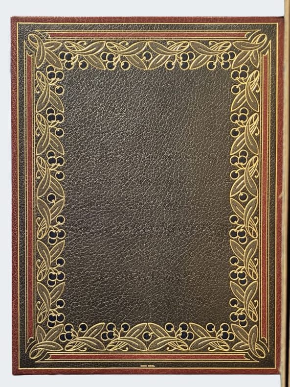 1902 Paris, Pelletan ; Boulogne-sur-Seine, Daniel Vierge, 1902 ; in-4 de xii-230 pp., [1] f., maroquin chaudron, encadrement mosaïqué composé de deux listels fauve brisés aux angles où s'enlace une feuille verte, reprise du décor au dos, doublures de maroquin vert bronze ornées d'un listel chaudron et d'une guirlande de grappes de cassis mosaïquées et dorées, gardes de soie brochée vieil or, doubles gardes, tranches dorées, couvertures, étui bordé (Marius Michel).