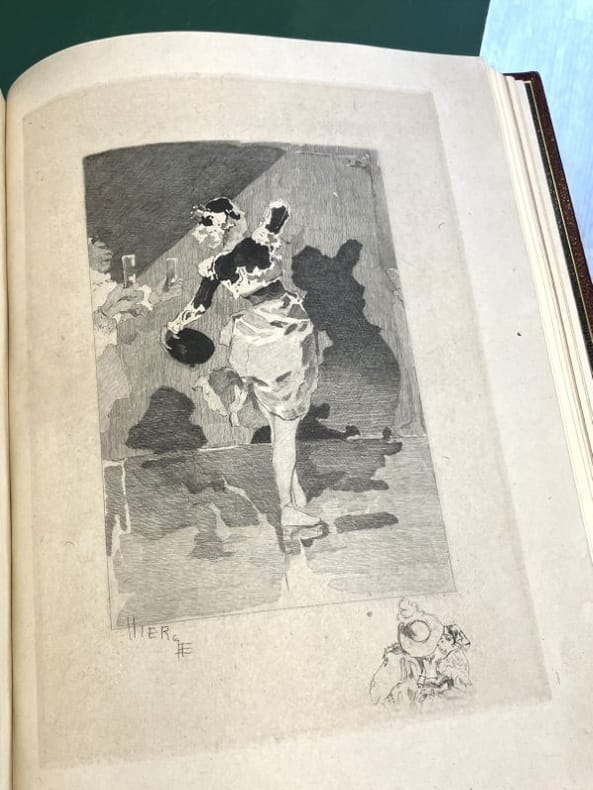 Paris, chez Edouard Pelletan ; chez Daniel Vierge, 1902 ; in-4 relié à la Bradel, plein vélin, plats et dos décorés de dessins à la plume de Vierge, titrage au dos, date en queue, tranches dorées, couvertures avec titre et dos conservés, étui doublé. 122 dessins. Edition originale de cette nouvelle traduction et premier tirage des dessins, un des 100 exemplaires sur papier de Chine, second papier, après 40 sur Japon, du tirage de tête (N° 138). Avec la signature de lartiste et la remarque au faux-titre. Exemplaire enrichi de la Suite de quatre aquarelles originales inédites de Daniel Vierge gravées à leau-forte par G. Noyon, en trois états dont leau-forte pure, avant la lettre avec remarque, avant la lettre avec le nom des artistes à la pointe ; relié en fin douvrage, le document de 3 ff.du prospectus rédigé par Edouard Pelletan. Le portrait en frontispice a été gravé à la manière noire. Très bel exemplaire sur chine enrichi des dessins de Vierge sur la reliure. Quelques frottements à l'étui.