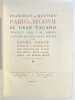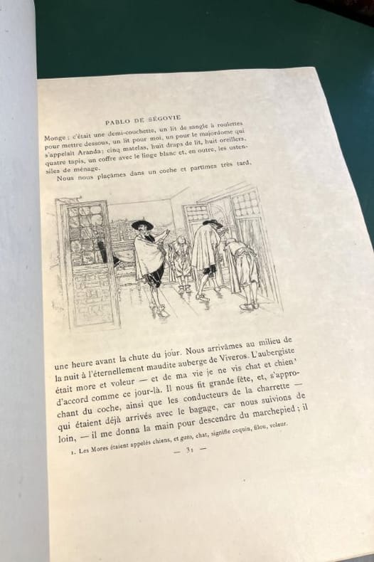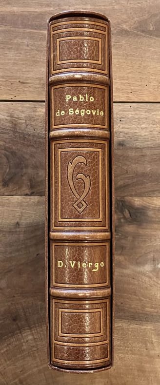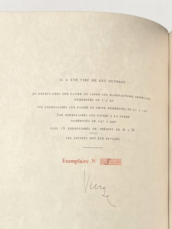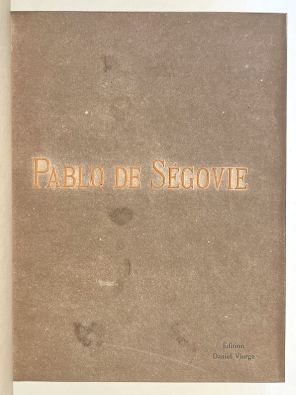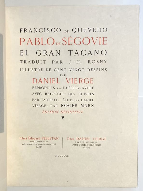 Édition de luxe, ornée de 120 dessins du peintre espagnol Daniel Vierge (1851-1904) reproduits en héliogravure sur cuivre avec des retouches de l'artiste, dont un portrait-frontispice et 3 hors-texte. La préface de Roger Marx, qui constitue une importante étude sur l'artiste, paraît ici pour la première fois. Publié en 1626 sous le titre La Vie de l'aventurier don Pablos de Ségovie, vagabond exemplaire et miroir des filous, le roman picaresque de Quevedo (1580-1645) narre les mésaventures d’un « vaurien » se débattant dans un univers grotesque et impitoyable. Tirage à 445 exemplaires numérotés. EXEMPLAIRE DESCAMPS-SCRIVE ET PETIET, en maroquin doublé et décoré de Marius Michel. C'est l'un des 40 exemplaires de tête sur Japon (n° 3), contenant une aquarelle originale en couleurs, signée par l'artiste, une suite de toutes les compositions sur Chine avant la lettre ainsi qu'une suite de 4 illustrations inédites, en 3 états sur Japon et sur Chine (eau-forte pure, avant la lettre avec remarque et avant la lettre avec le nom des artistes à la pointe). Le volume porte l'ex-libris doré sur cuir de René Descamps-Scrive (1853-1924), l'un des plus importants bibliophiles du tournant-de-siècle. On le retrouve ensuite dans la fastueuse bibliothèque de Henri M. Petiet (cat. VIII, 1997, n° 191, sans marque de provenance), qui avait perpétué la tradition des Beraldi, Barthou et Descamps-Scrive. SUPERBE RELIURE MOSAÏQUÉE DE MARIUS MICHEL. Le décor floral qui orne les doublures est typique de son apport dans le domaine de la reliure ornementale. Dos éclairci, couverture légèrement tachée.