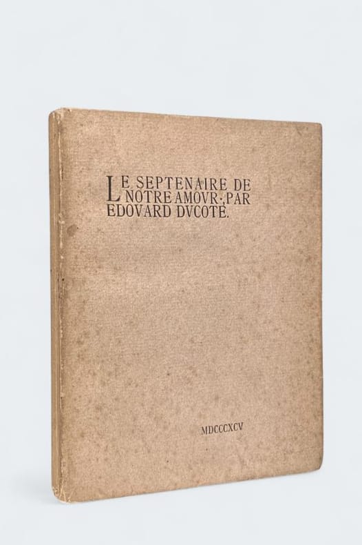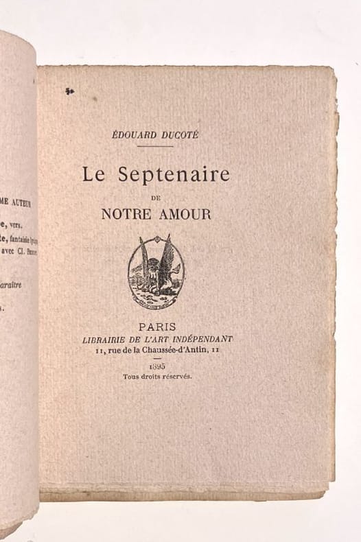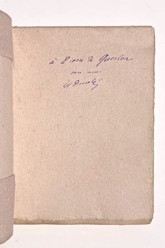 Édition originale et premier texte en prose d'Édouard Ducoté (1870-1929). Ami d'André Gide et d'Henri Ghéon, il reprit en 1896 la revue L'Ermitage pour en faire l'étendard des symbolistes indépendants. Tirage à 300 exemplaires sur Ingres rose. ENVOI AUTOGRAPHE SIGNÉ « à Pierre de Querlon, son ami ». Pierre de Querlon était le pseudonyme littéraire de Pierre Des Gachons, frère de l'écrivain Jacques Des Gachons, disparu à 24 ans seulement. Touchante provenance. Piqûres sur la couverture.