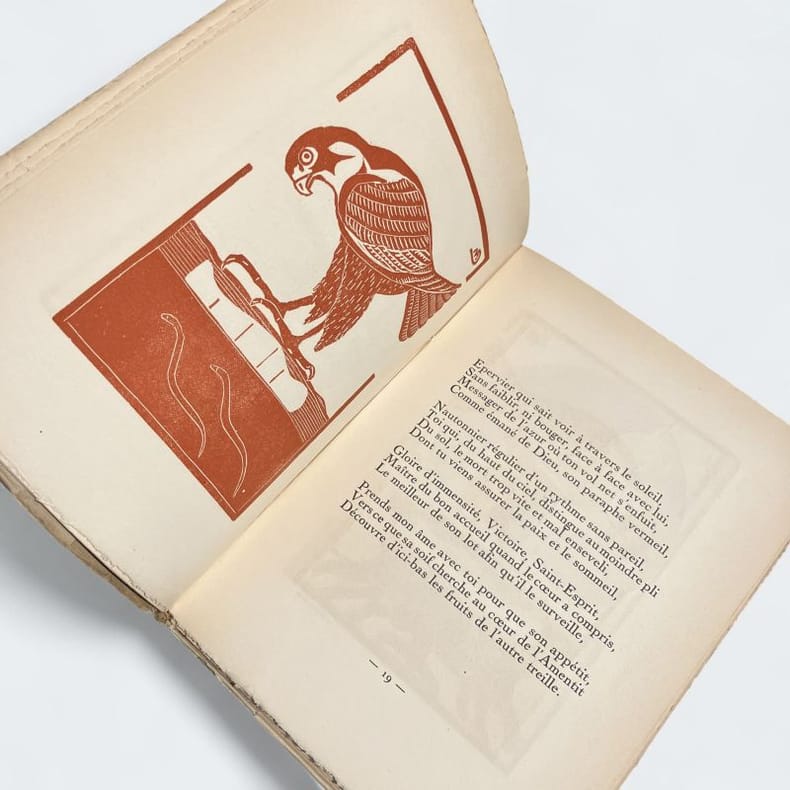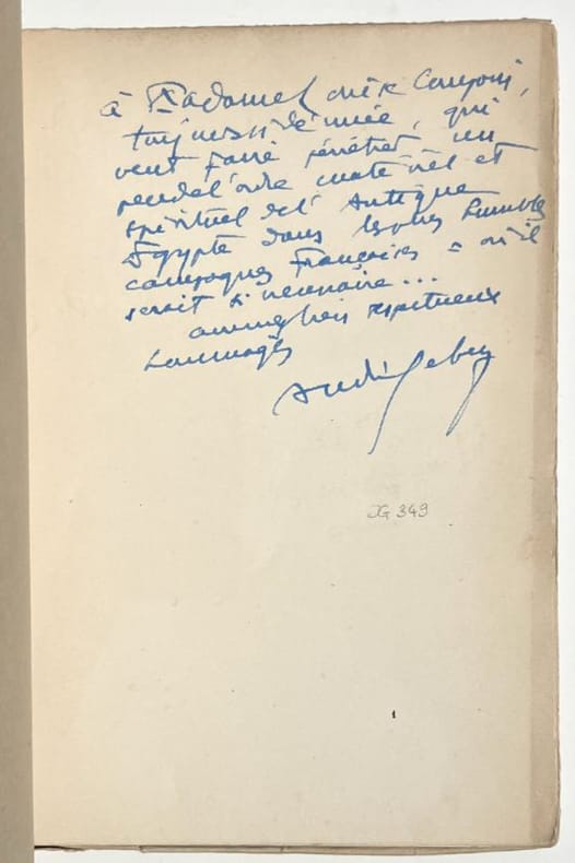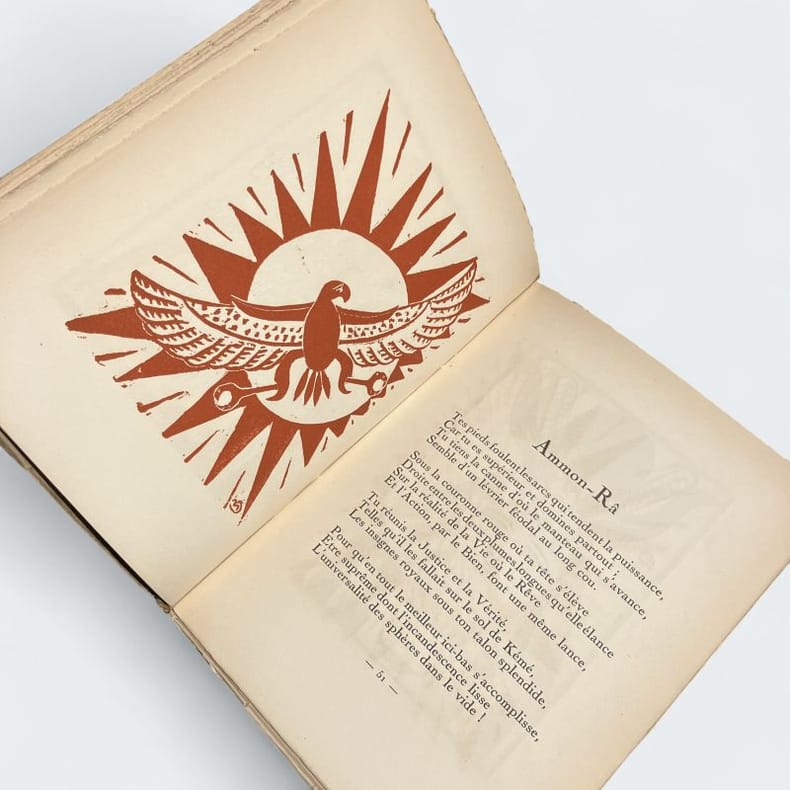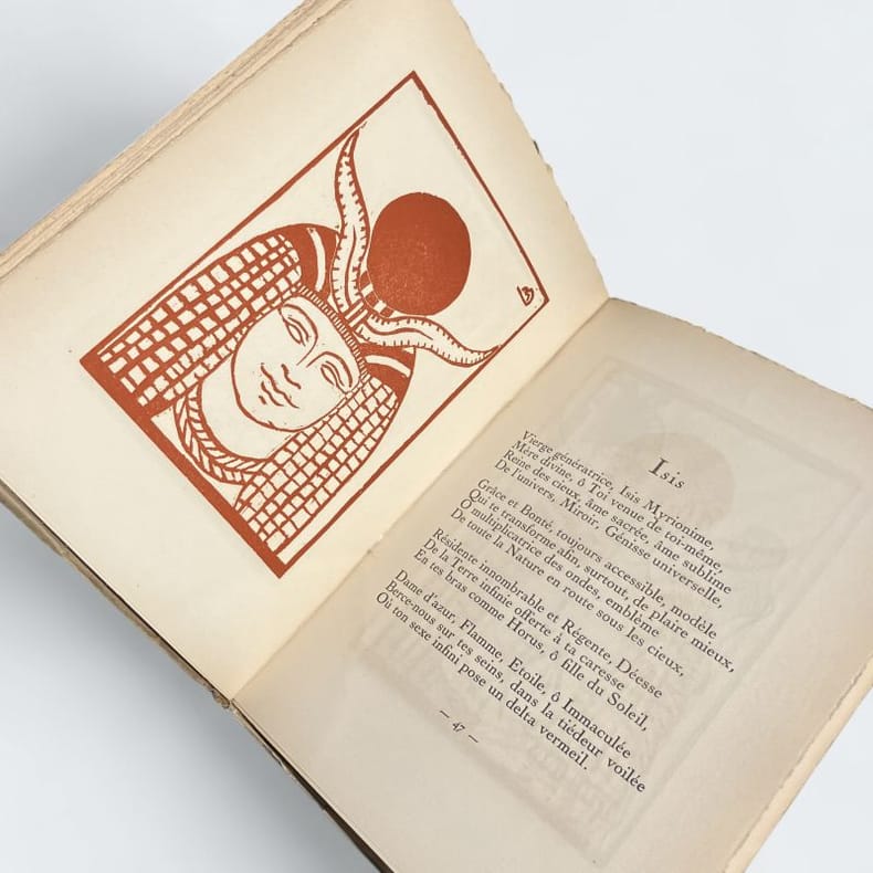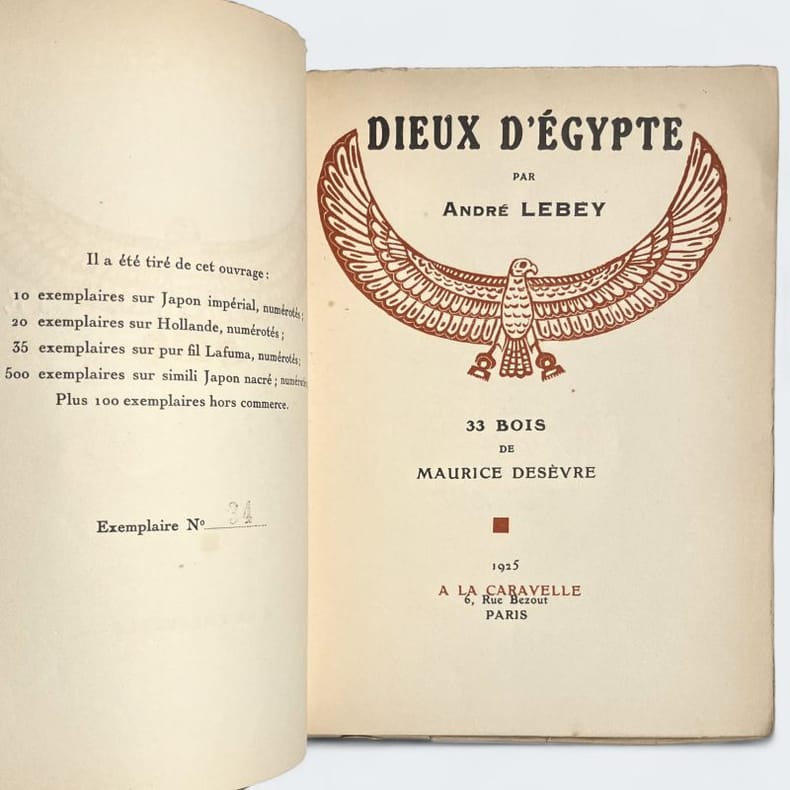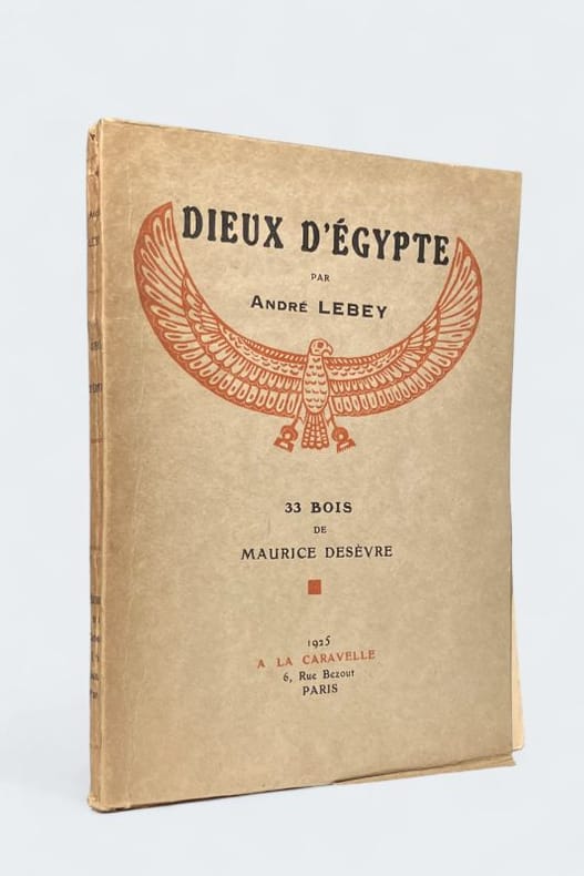Édition originale, ornée de 33 bois gravés de Maurice Desèvre tirés en rouge. Tirage à 665 exemplaires, celui-ci un des 35 sur vélin pur fil, 3e papier. Il porte un envoi autographe signé : « à Madame Louise [Caupoin ?], toujours si dévouée, qui veut faire pénétrer un peu de l'art [???] et spirituel de l'Antique Égypte dans les plus humbles campagnes françaises, où il serait si nécessaire... avec mes bien respectueux hommages... » Très bon exemplaire.